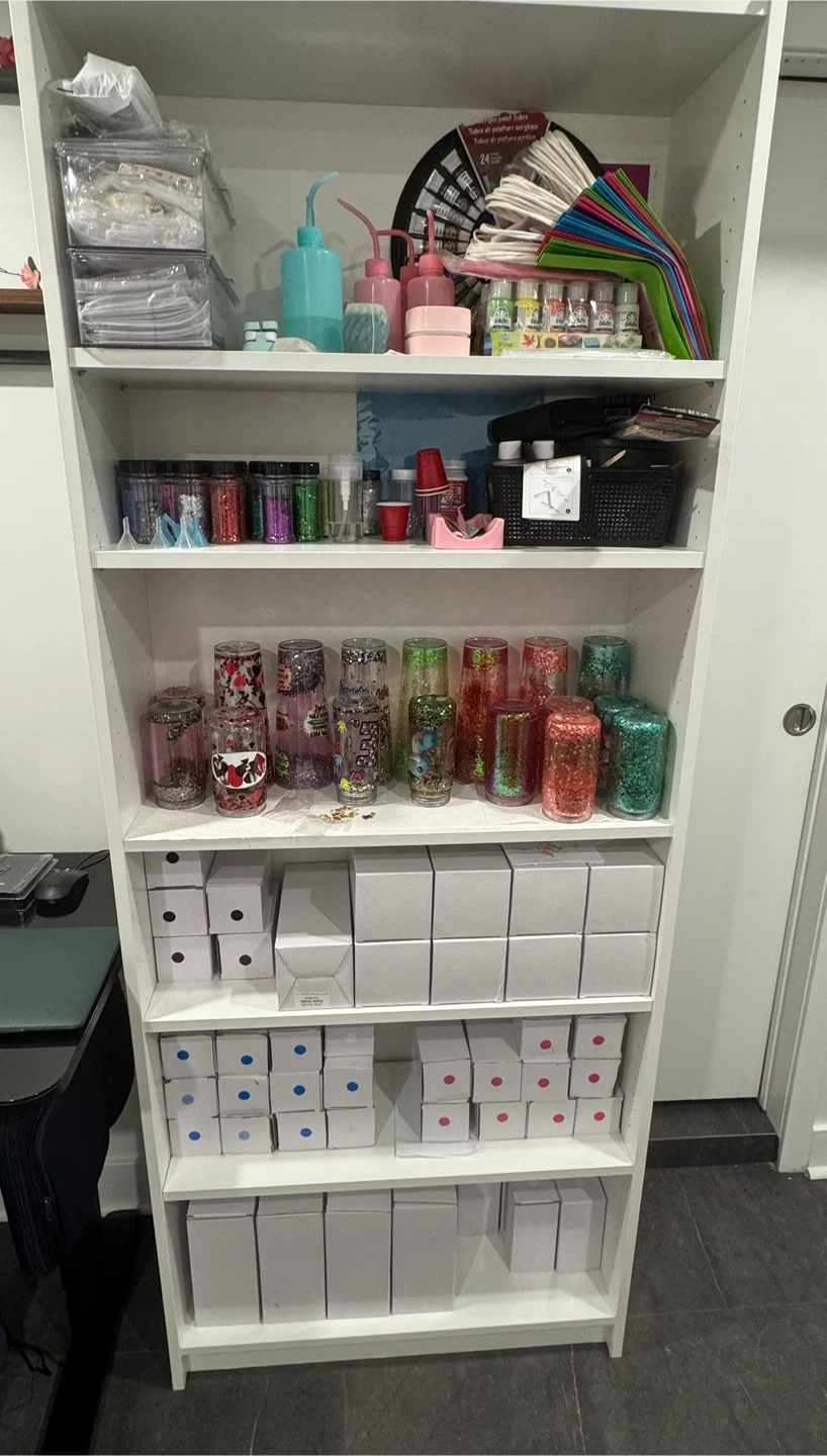 Selling my snow globe business- shelf includes 24+ new tumblers in boxes, 14 additional tumblers already made , 100+ tumblers decals, 80+ assorted glitters, materials and tools, solutions and my personal step by step guide on how to make the cups from start to finish