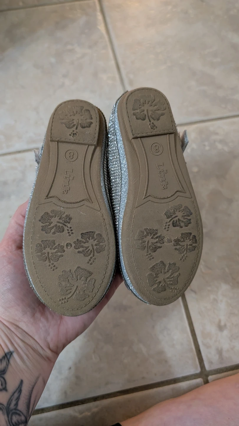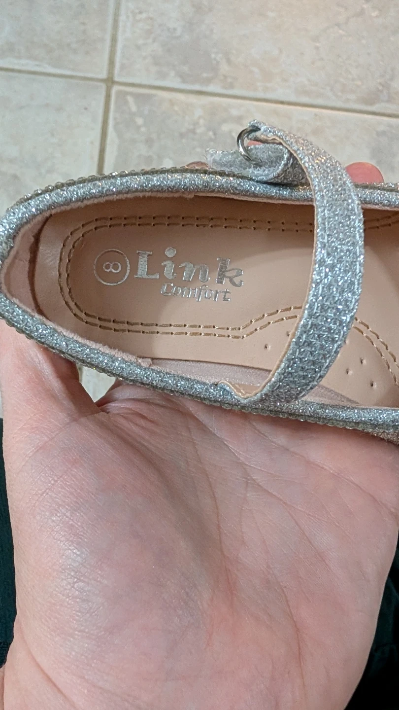 These adorable Link Comfort girls' shoes are in size 8. They feature a sparkly silver glitter design with a cute butterfly detail. They are in good condition and ready for a new little owner!