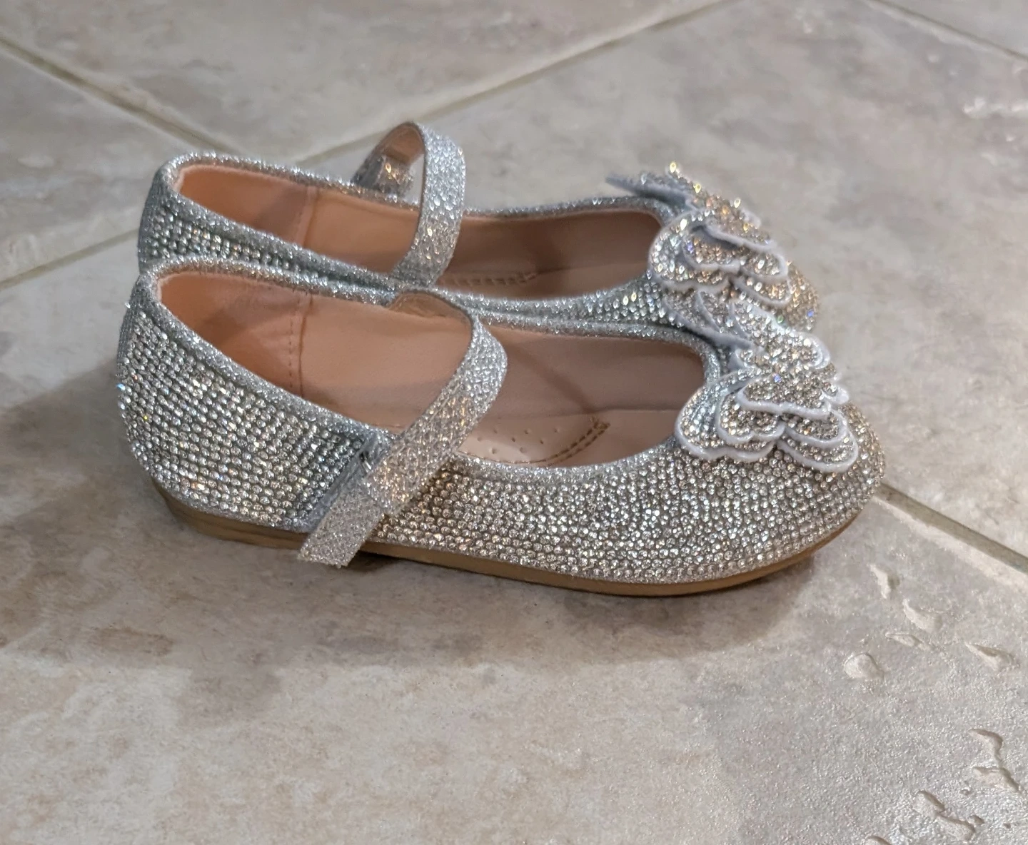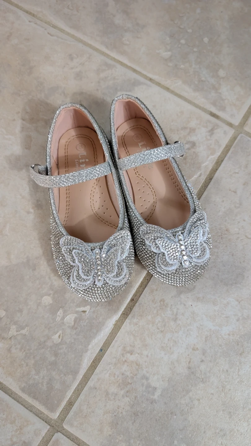 These adorable Link Comfort girls' shoes are in size 8. They feature a sparkly silver glitter design with a cute butterfly detail. They are in good condition and ready for a new little owner!