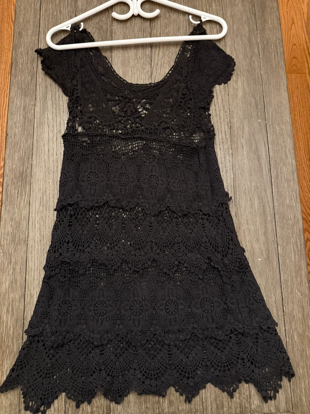 Selling a lovely black crochet dress! It's in great condition and perfect for summer. The intricate crochet detailing adds a touch of elegance. It is a tiered dress with short sleeves.