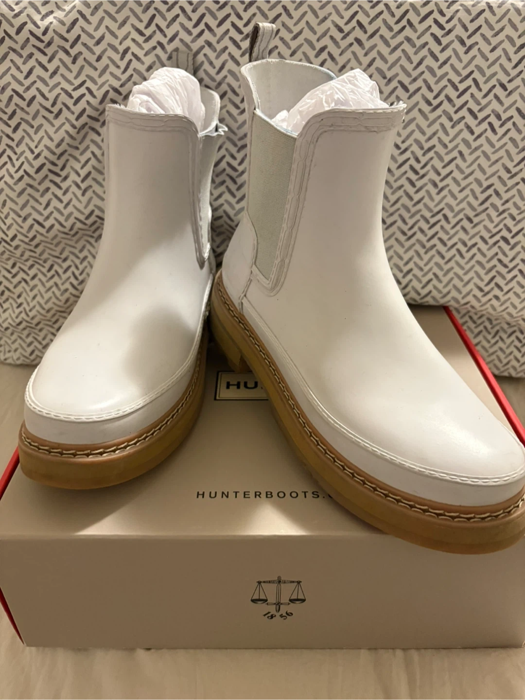 Selling a pair of Hunter Stitch Detail Chelsea boots in white! They are in excellent condition and come with the original box. Size is US 7 / EU 38