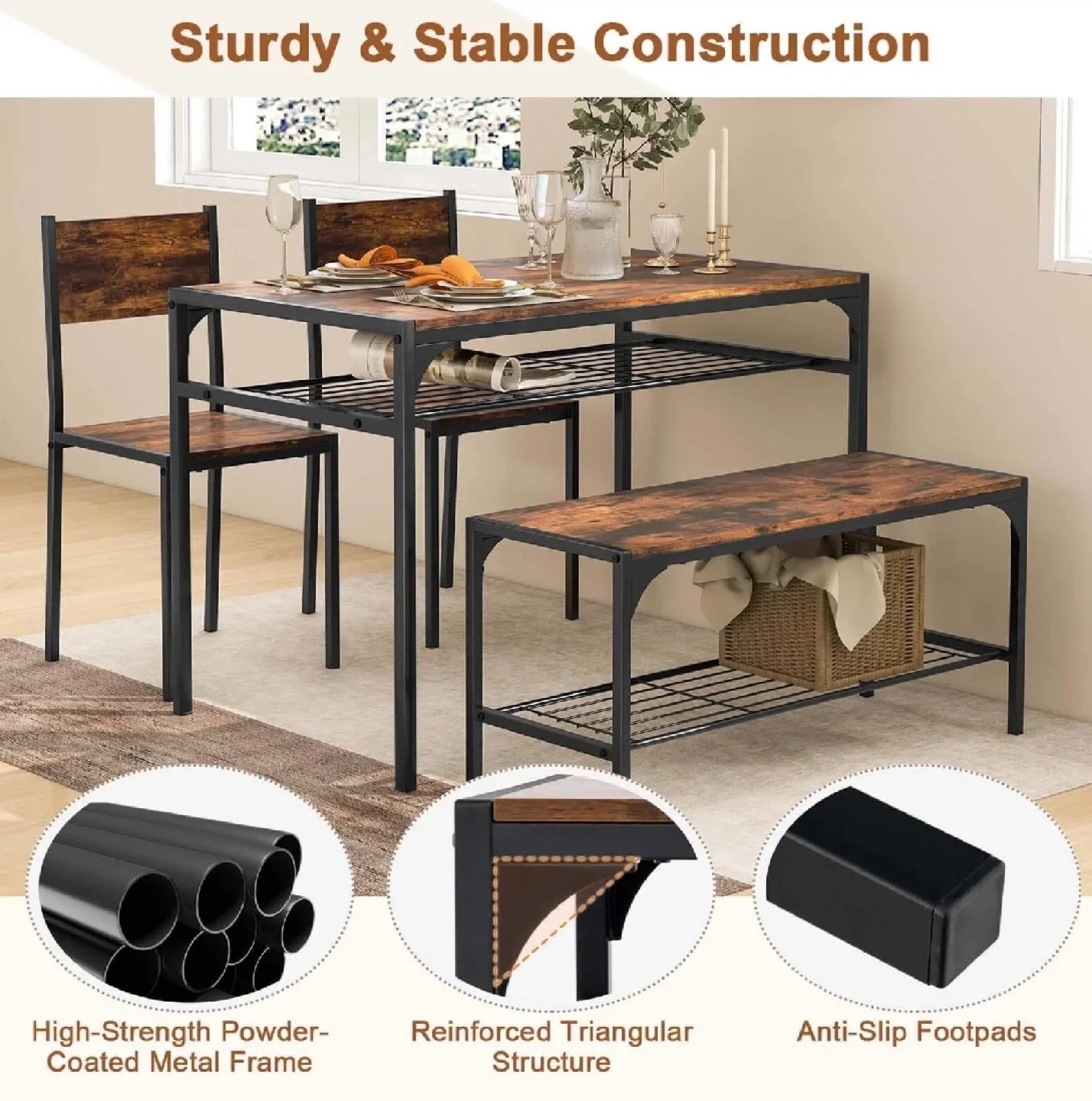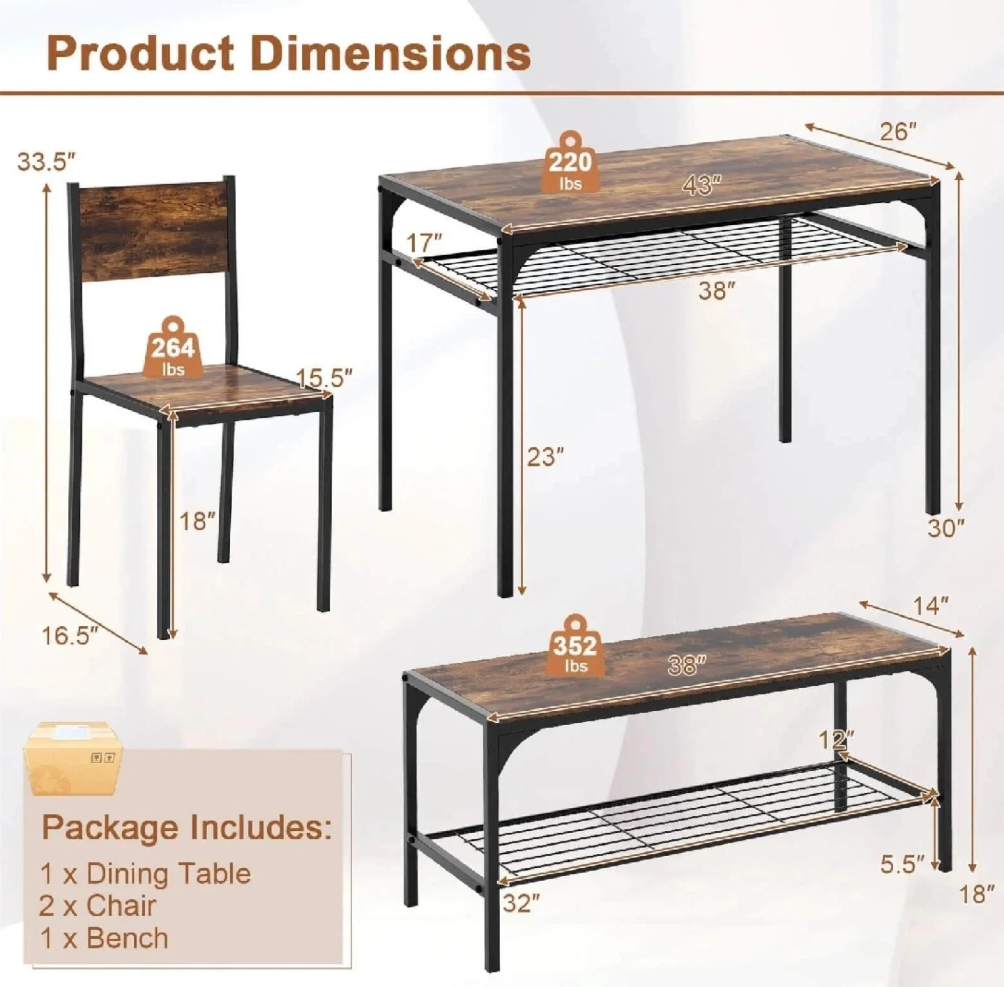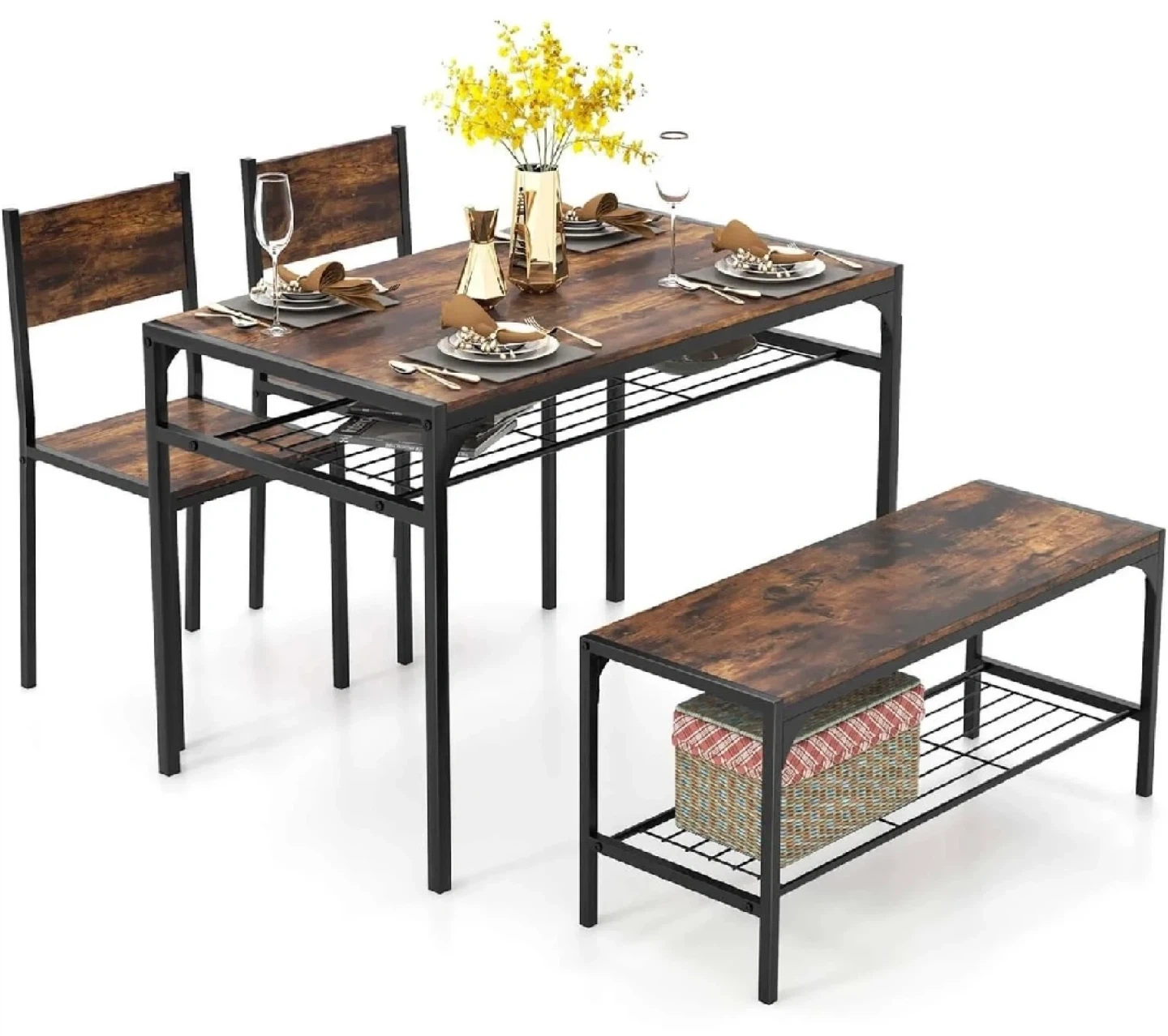 This brand new in box 4-piece dining set features a rustic brown finish, adding a touch of warmth and style to any dining space. The set includes a table, two chairs, and a bench, perfect for small gatherings or family meals. The sturdy construction ensures durability, while the compact design makes it ideal for smaller homes or apartments.