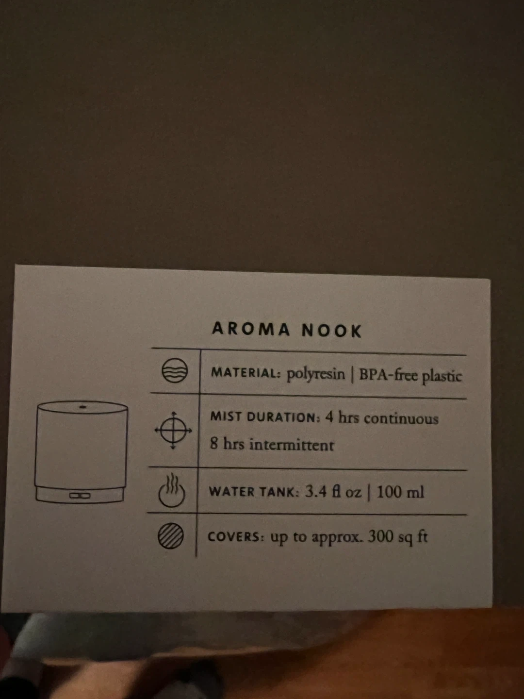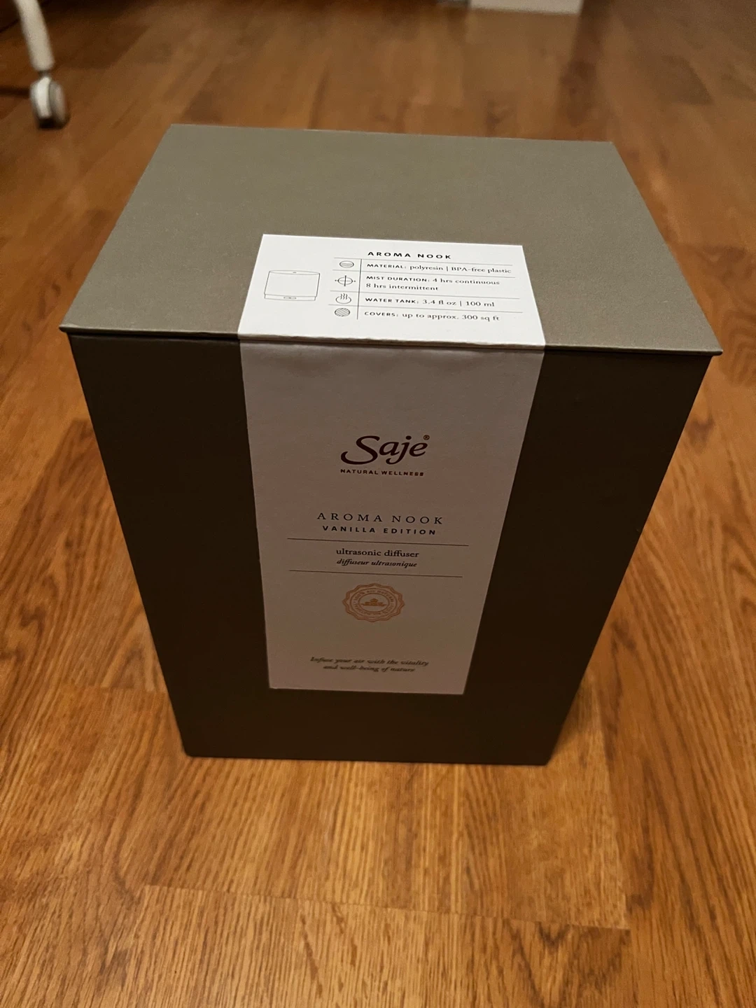 Selling a Saje Aroma Nook Vanilla Edition ultrasonic diffuser! It's made of polyresin and BPA-free plastic. The mist duration is 4 hours continuous or 8 hours intermittent. The water tank holds 3.4 fl oz | 100 ml and covers up to approximately 300 sq ft. The box is included!