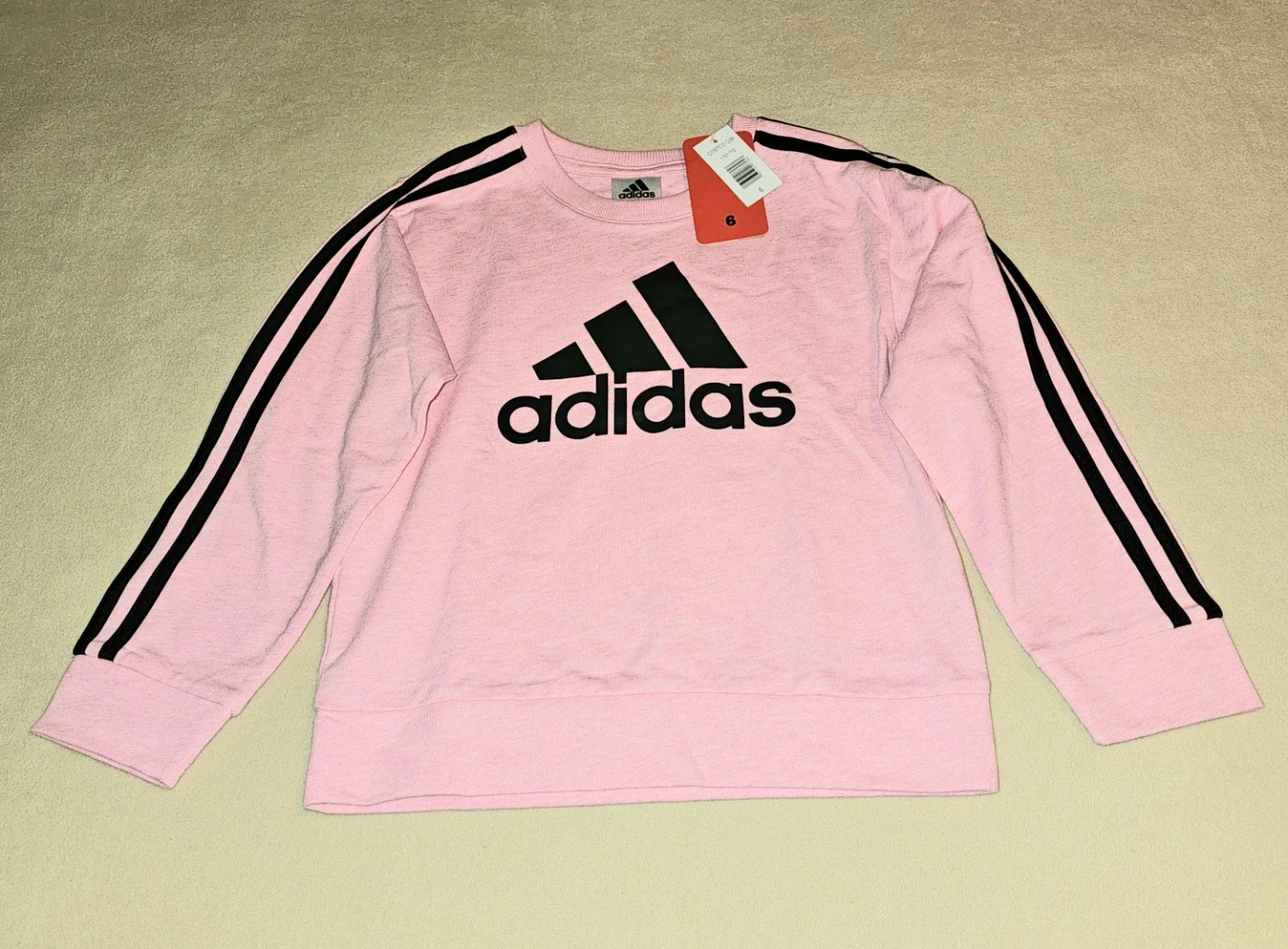 Selling a cute Kids Adidas sweatshirt in pink! It features the Adidas logo on the front and the signature three stripes on the sleeves. Size 6 New with Tag $7