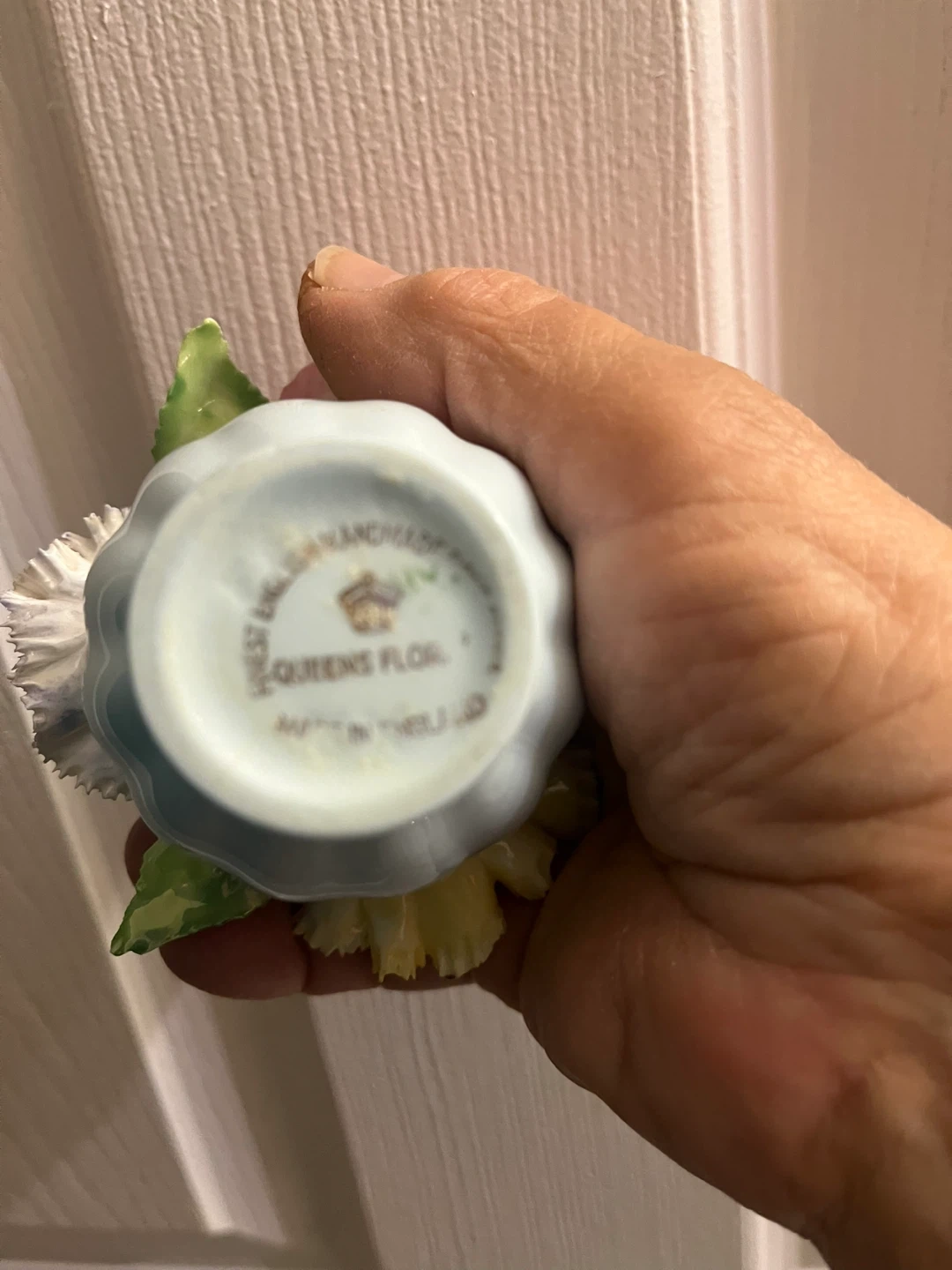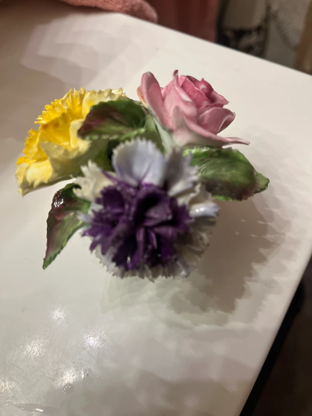 This is a beautiful Handmade Bone China Floral arrangement figurine. It features a trio of blossoms- a pink rose and two carnations, yellow and purple. The workmanship is stunning, and must be seen to be appreciated.