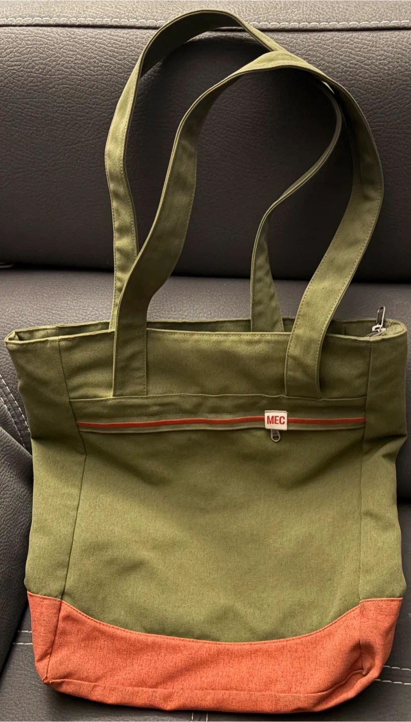 A zippered MEC shoulder tote bag in olive green with pink hue accents. It has 4 pockets internally with one zippered front pocket.