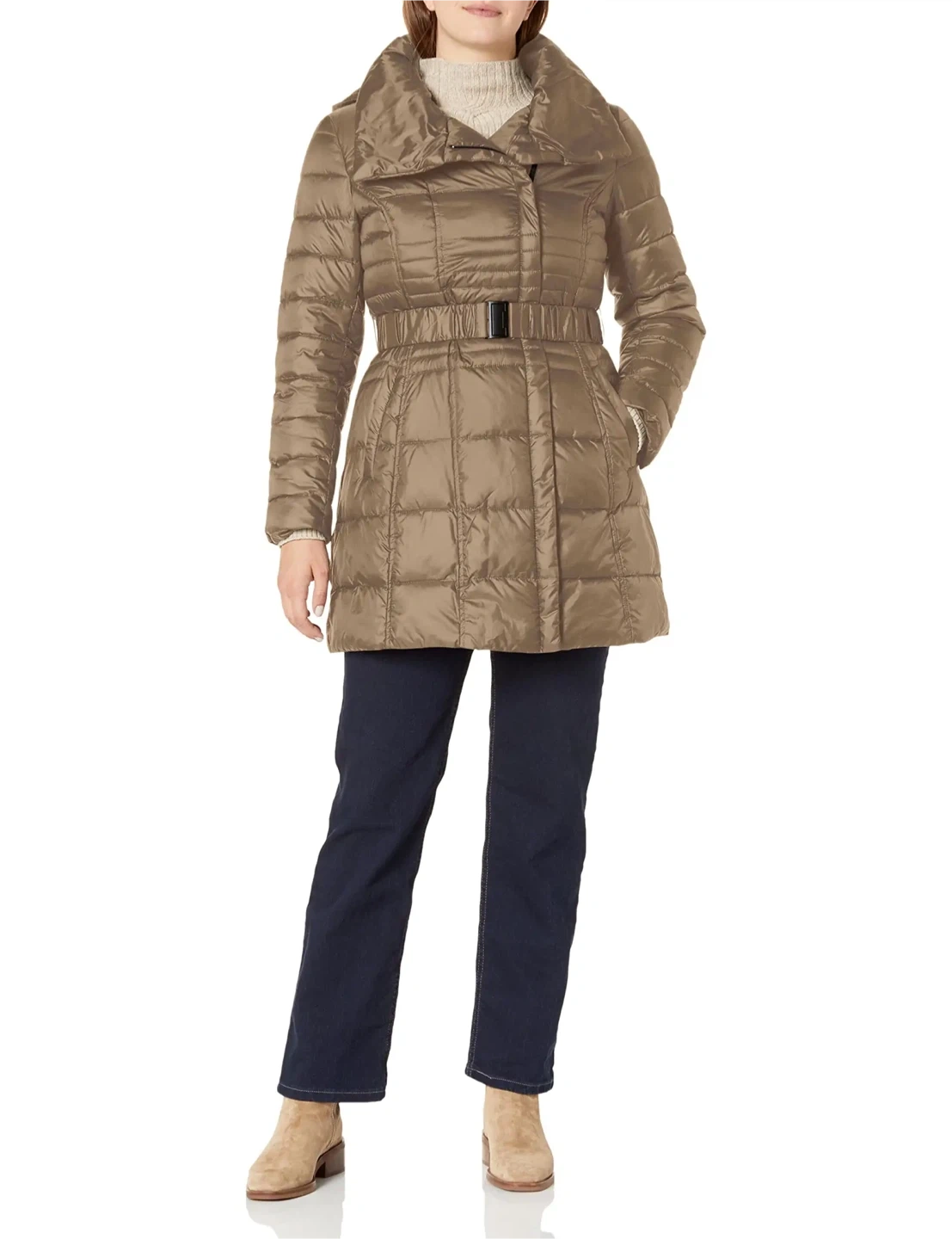 Here's a stylish belted puffer coat in a lovely brown colour. It's perfect for staying warm and fashionable during the colder months. The belted design adds a flattering silhouette to this cozy coat. It's in great condition and ready for a new owner! Hardly used once