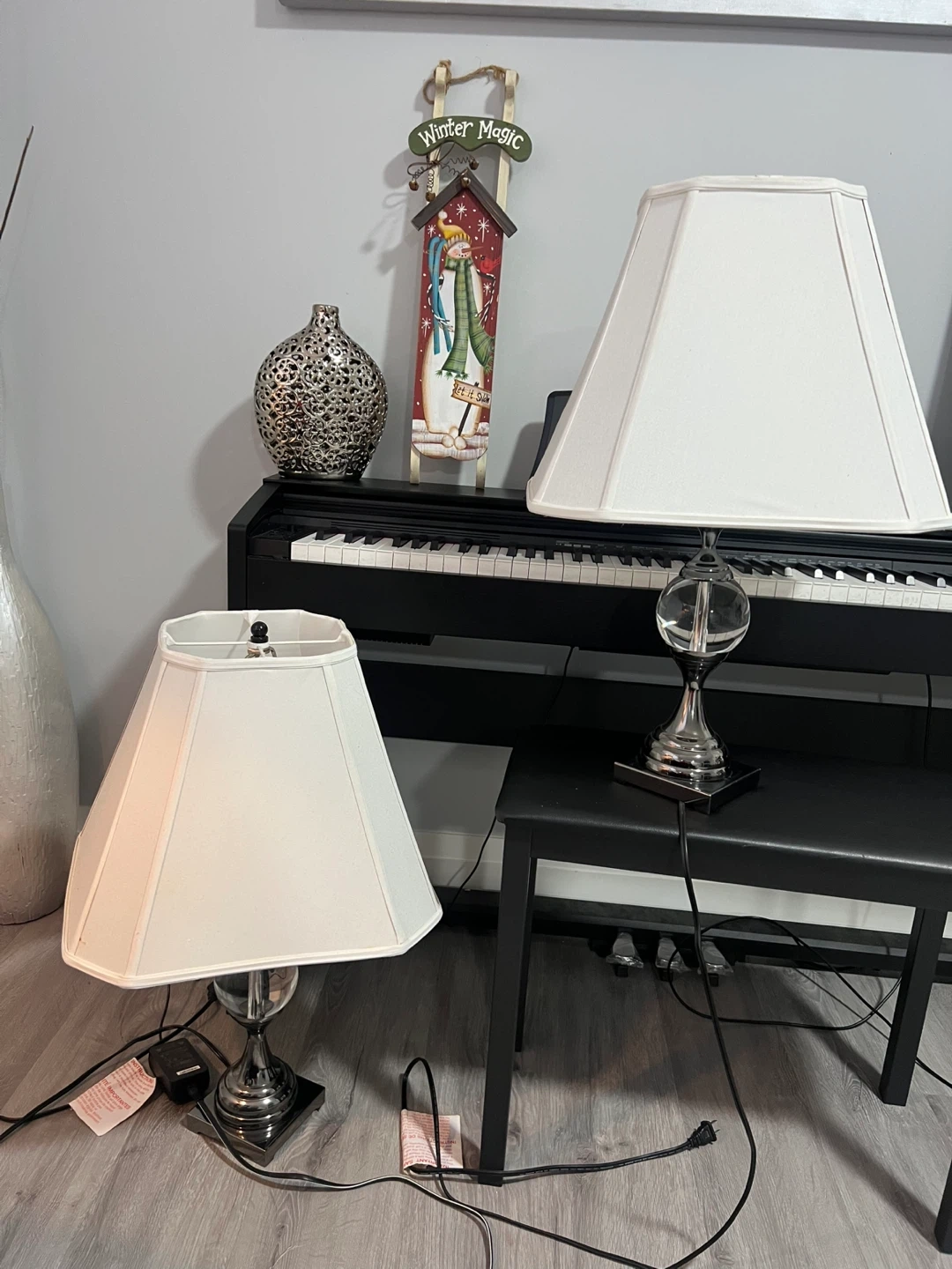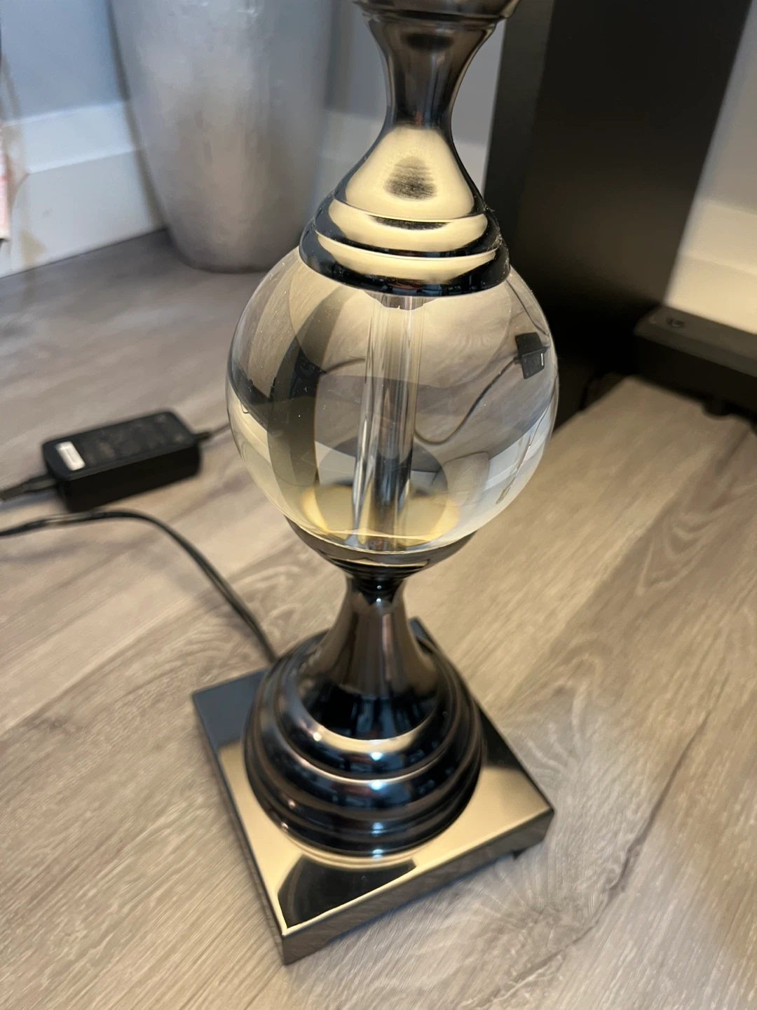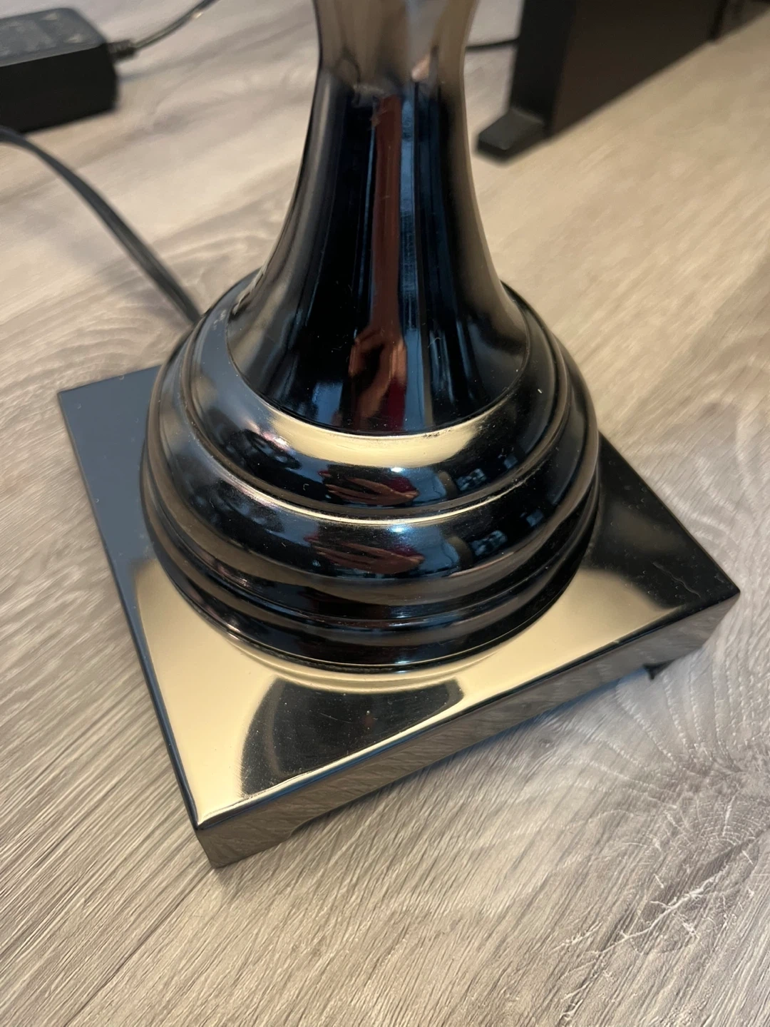 Here's a table lamp with a chrome base and a white shade. It would look great in any room!