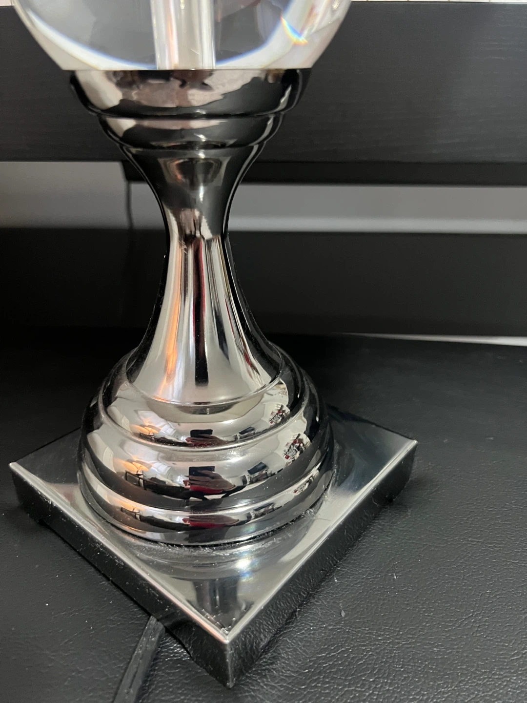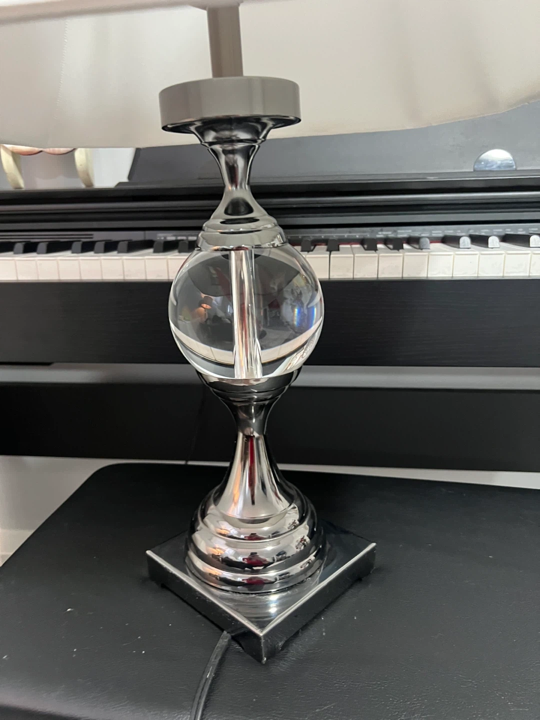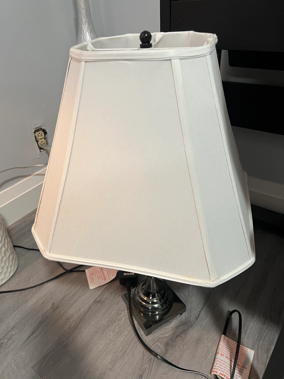 Here's a table lamp with a chrome base and a white shade. It would look great in any room!