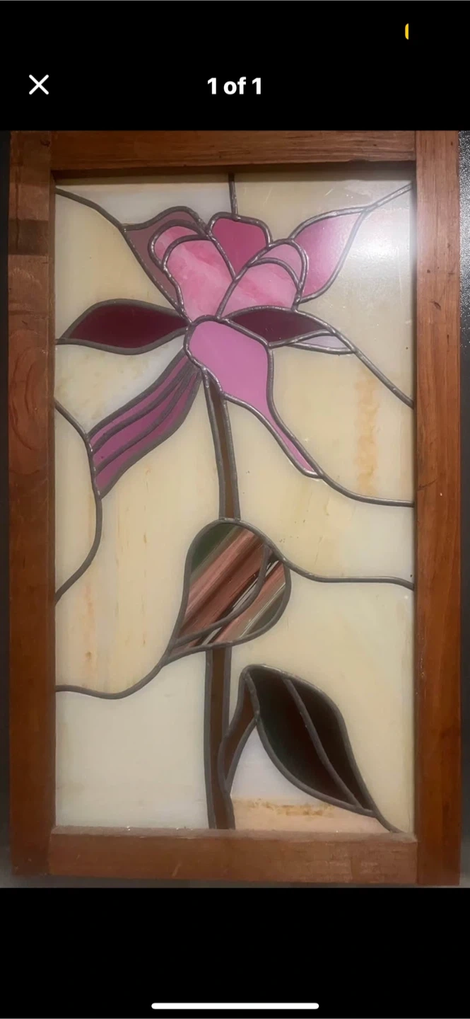 Here's a beautiful stained glass panel featuring a lovely flower design. It's framed in wood and would make a great addition to any room. It's in good condition and ready to brighten up your space!