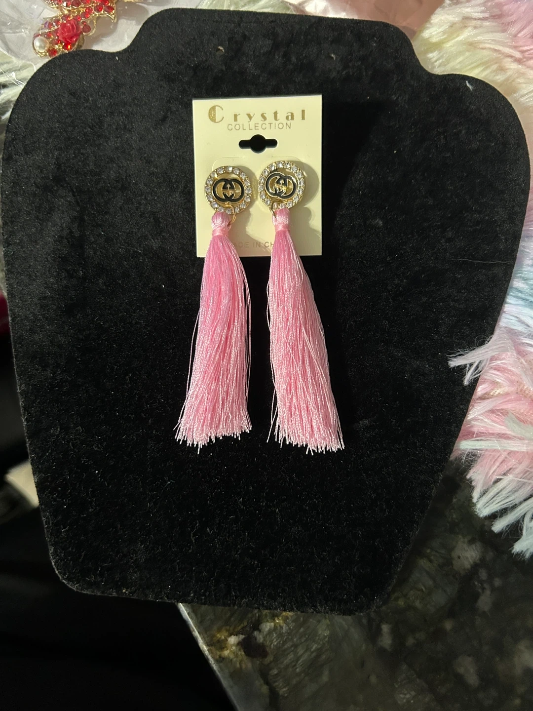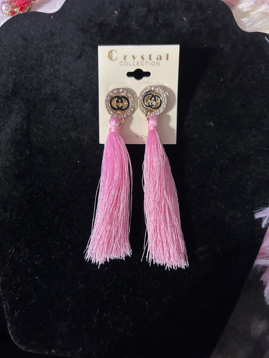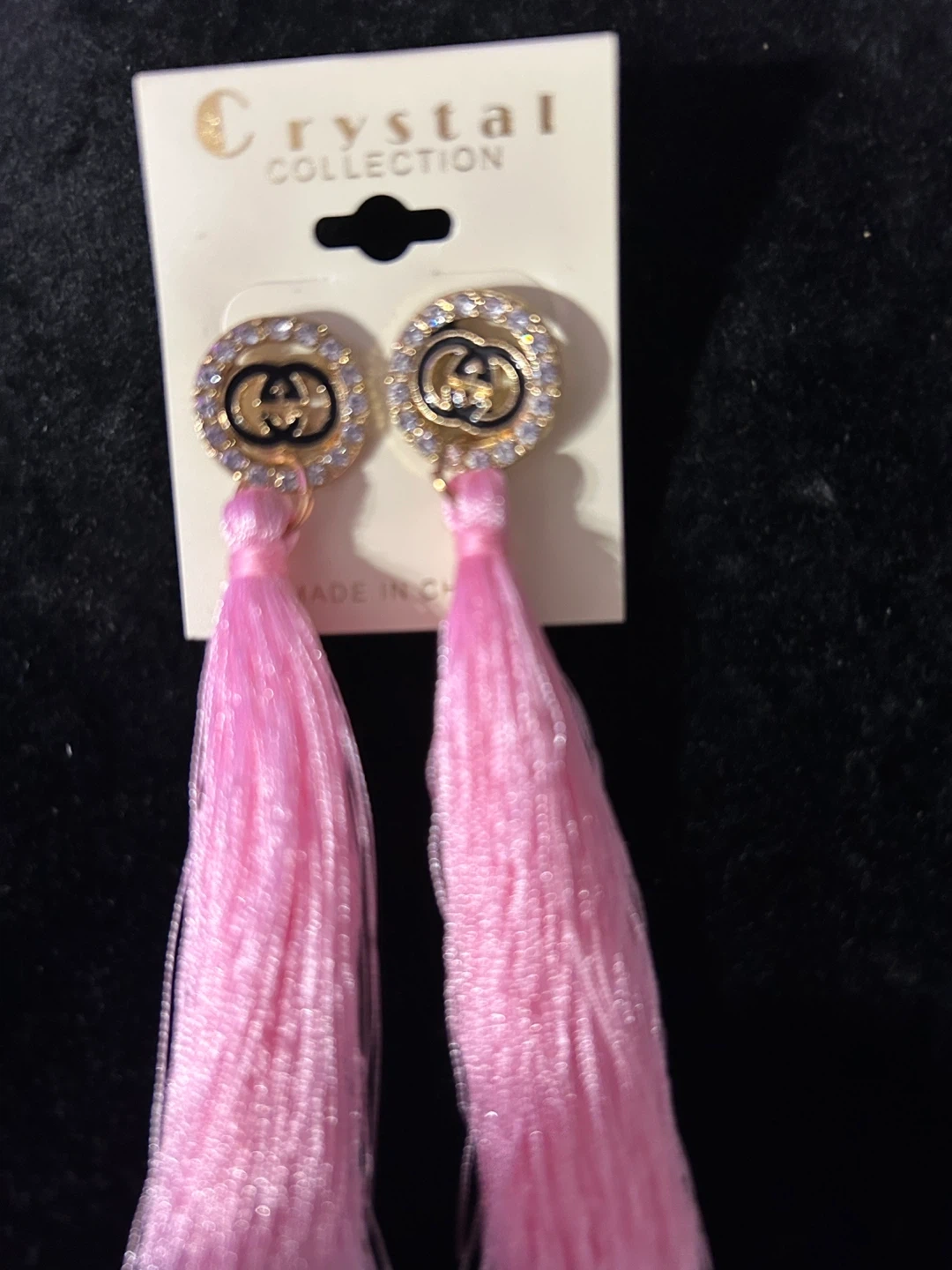 These are a pair of Crystal Collection earrings. They have a round, gold-colored top with a design and clear stones. The tassels are a light pink color.