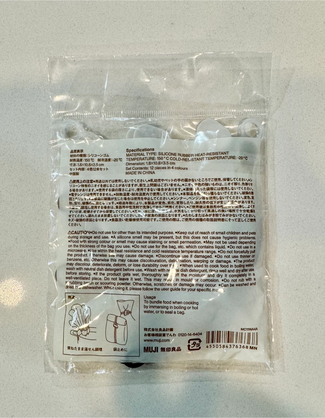 Here are MUJI silicone multipurpose bands! There are 12 pieces included in the set. These bands are great for tying up food or gadgets. They are able to withstand freezing and boiling.