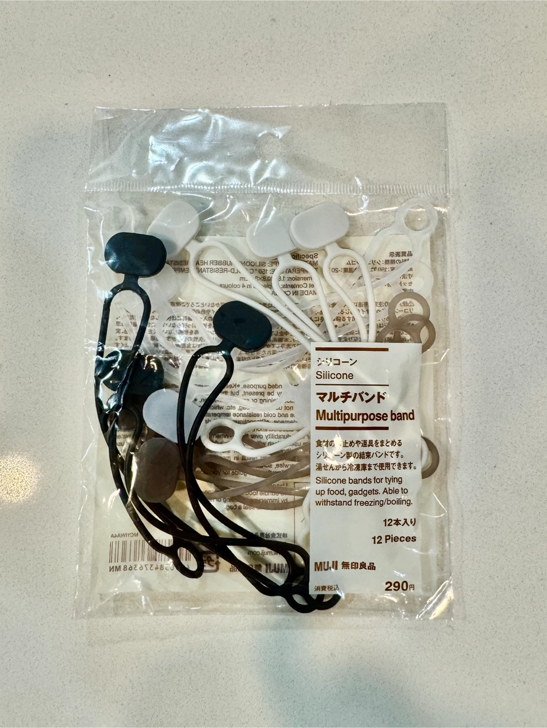Here are MUJI silicone multipurpose bands! There are 12 pieces included in the set. These bands are great for tying up food or gadgets. They are able to withstand freezing and boiling.