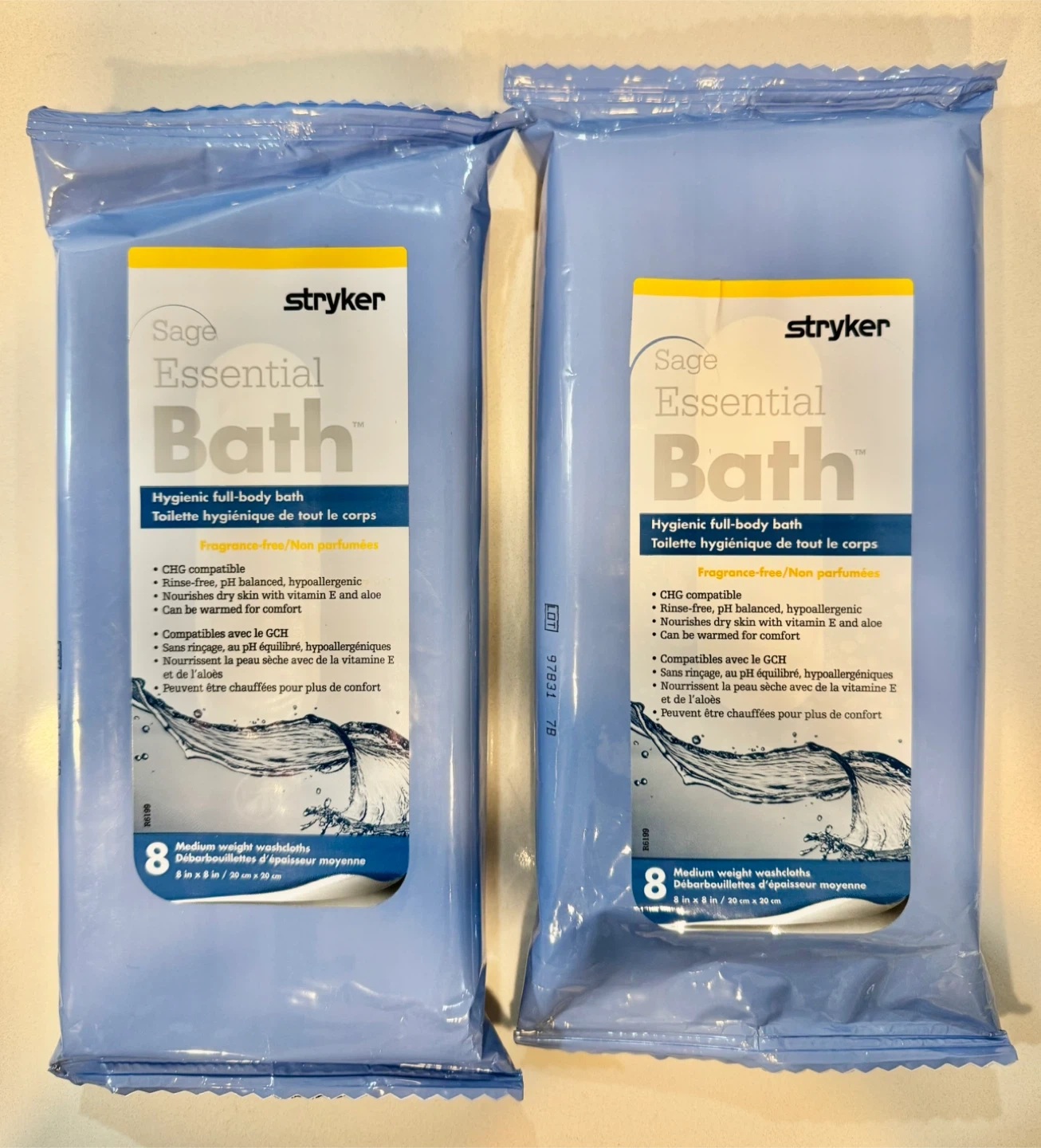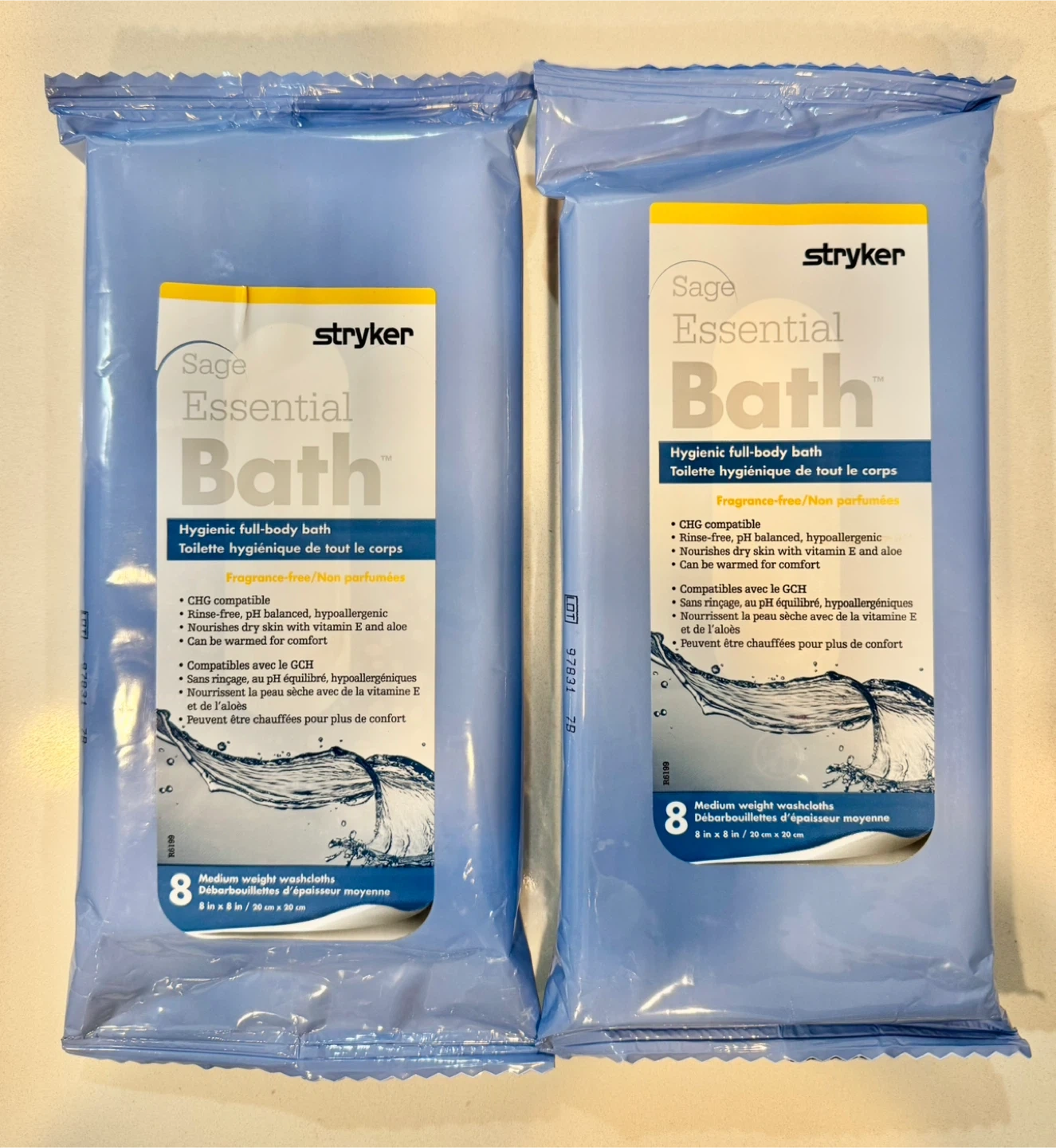 I'm selling Sage Essential Bath washcloths. These are hygienic full-body bath cloths that are fragrance-free. They are rinse-free, pH balanced, hypoallergenic, and nourish the skin with vitamin E and aloe. Each cloth is 8 in x 8 in / 20 cm x 20 cm. They can be warmed for comfort too!