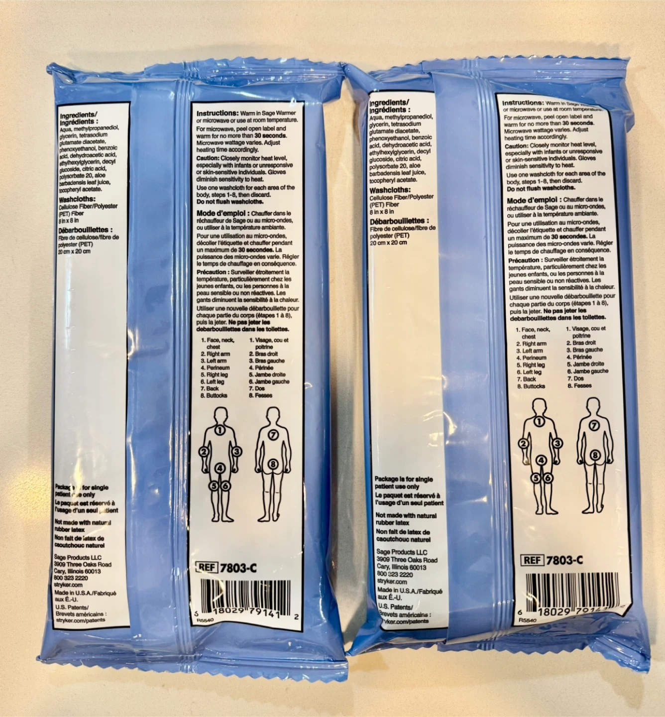 I'm selling Sage Essential Bath washcloths. These are hygienic full-body bath cloths that are fragrance-free. They are rinse-free, pH balanced, hypoallergenic, and nourish the skin with vitamin E and aloe. Each cloth is 8 in x 8 in / 20 cm x 20 cm. They can be warmed for comfort too!