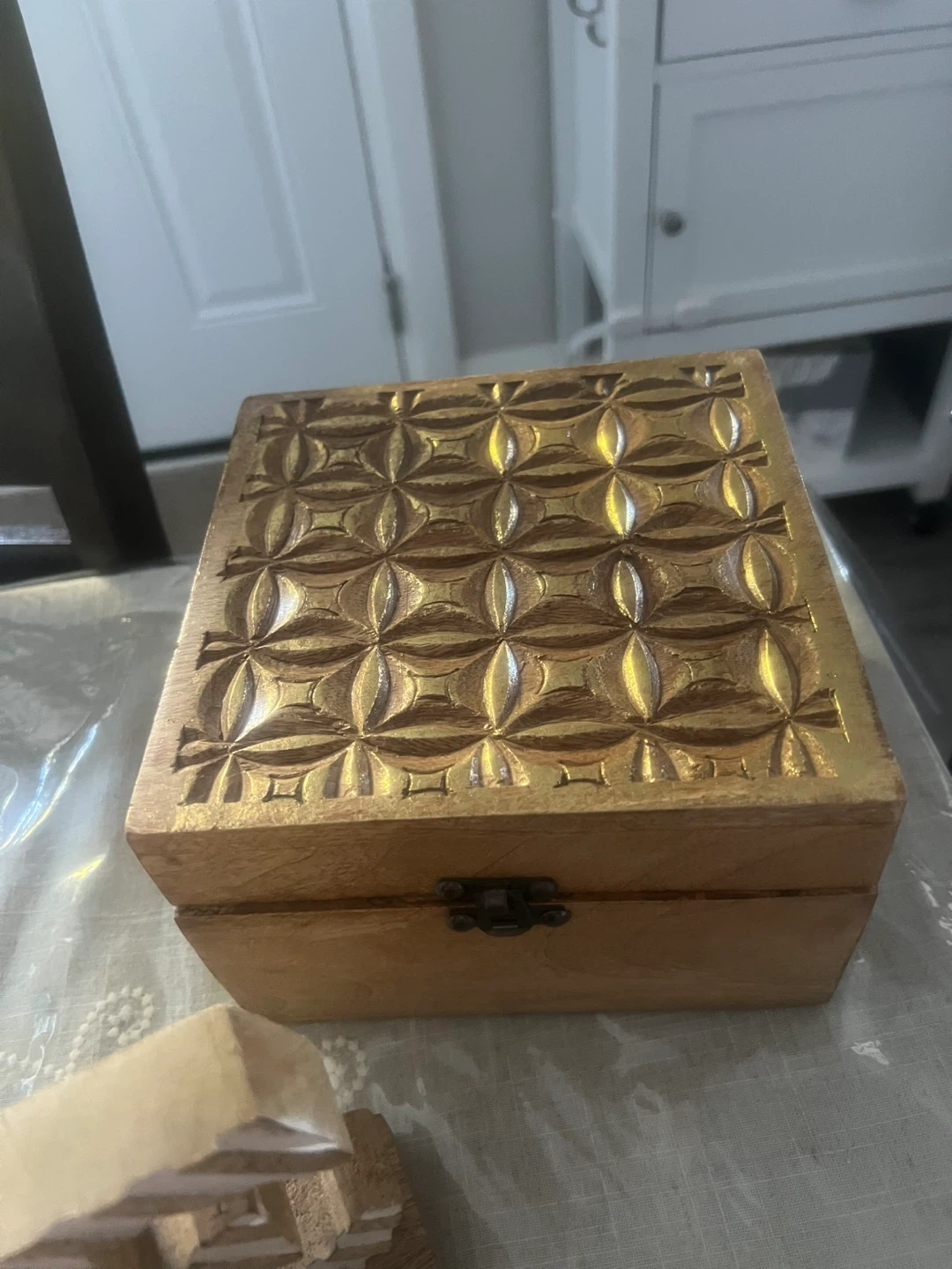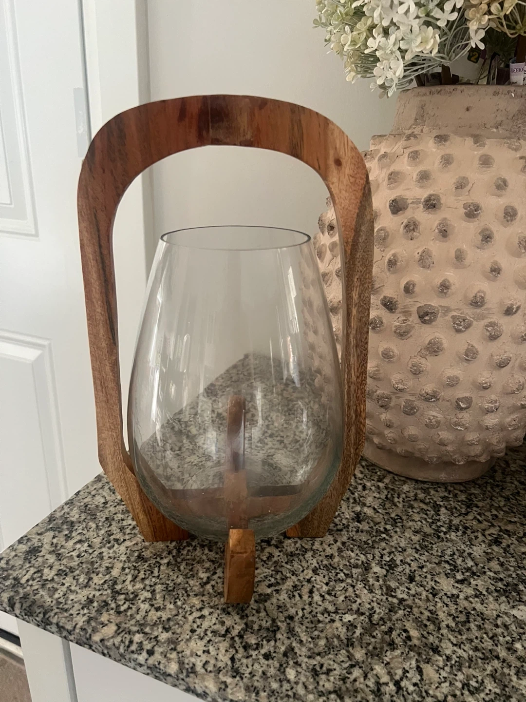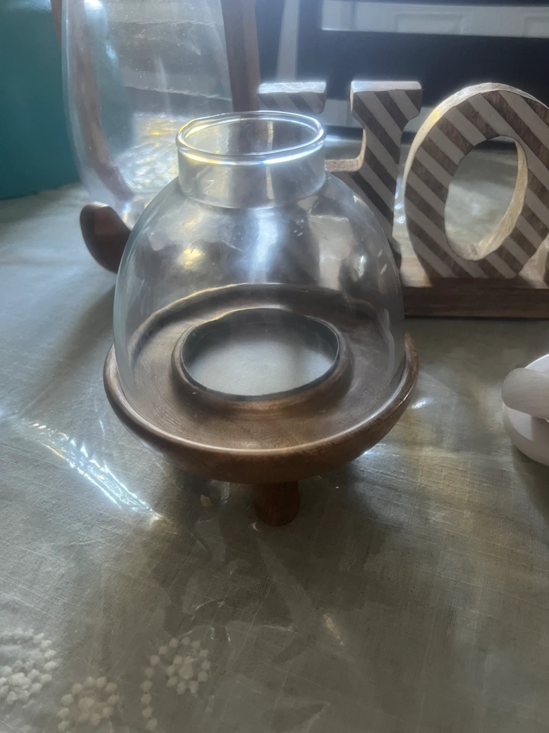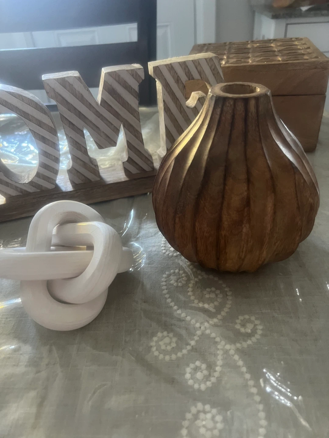 Selling a bundle of home decor items! Includes a wooden vase with a glass insert, a decorative wooden box, a glass cloche with a wooden base, a decorative 'HOME' sign, a wooden vase, and a decorative knot. All items are in great condition and ready to add some charm to your space