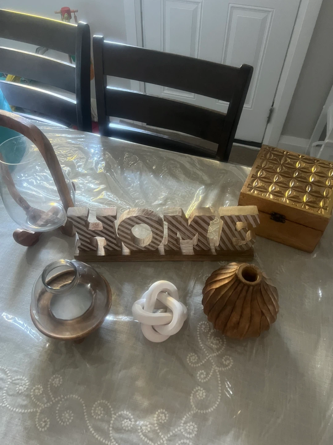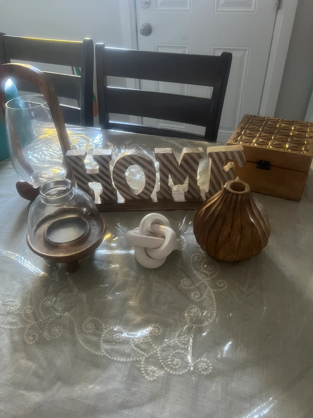 Selling a bundle of home decor items! Includes a wooden vase with a glass insert, a decorative wooden box, a glass cloche with a wooden base, a decorative 'HOME' sign, a wooden vase, and a decorative knot. All items are in great condition and ready to add some charm to your space