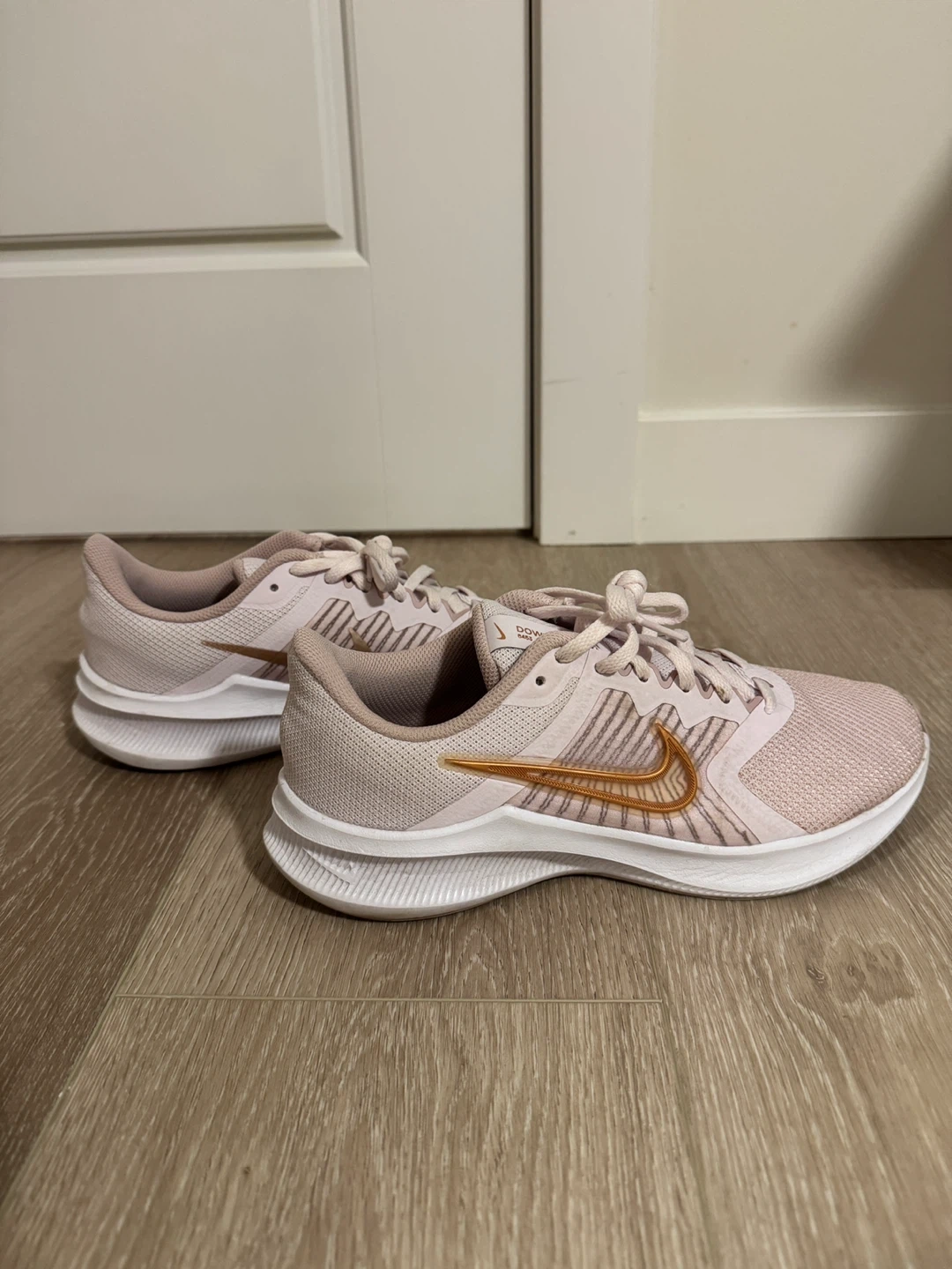 Selling a pair of Nike Downshifter 11 women's running shoes. They are in good condition and ready for your next run! The shoes are a light pink colour with a bronze swoosh.