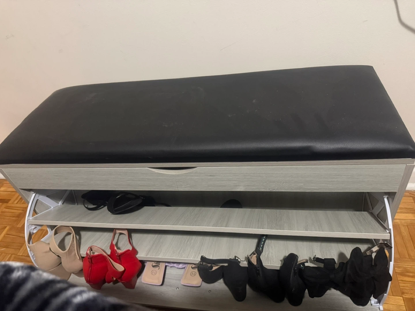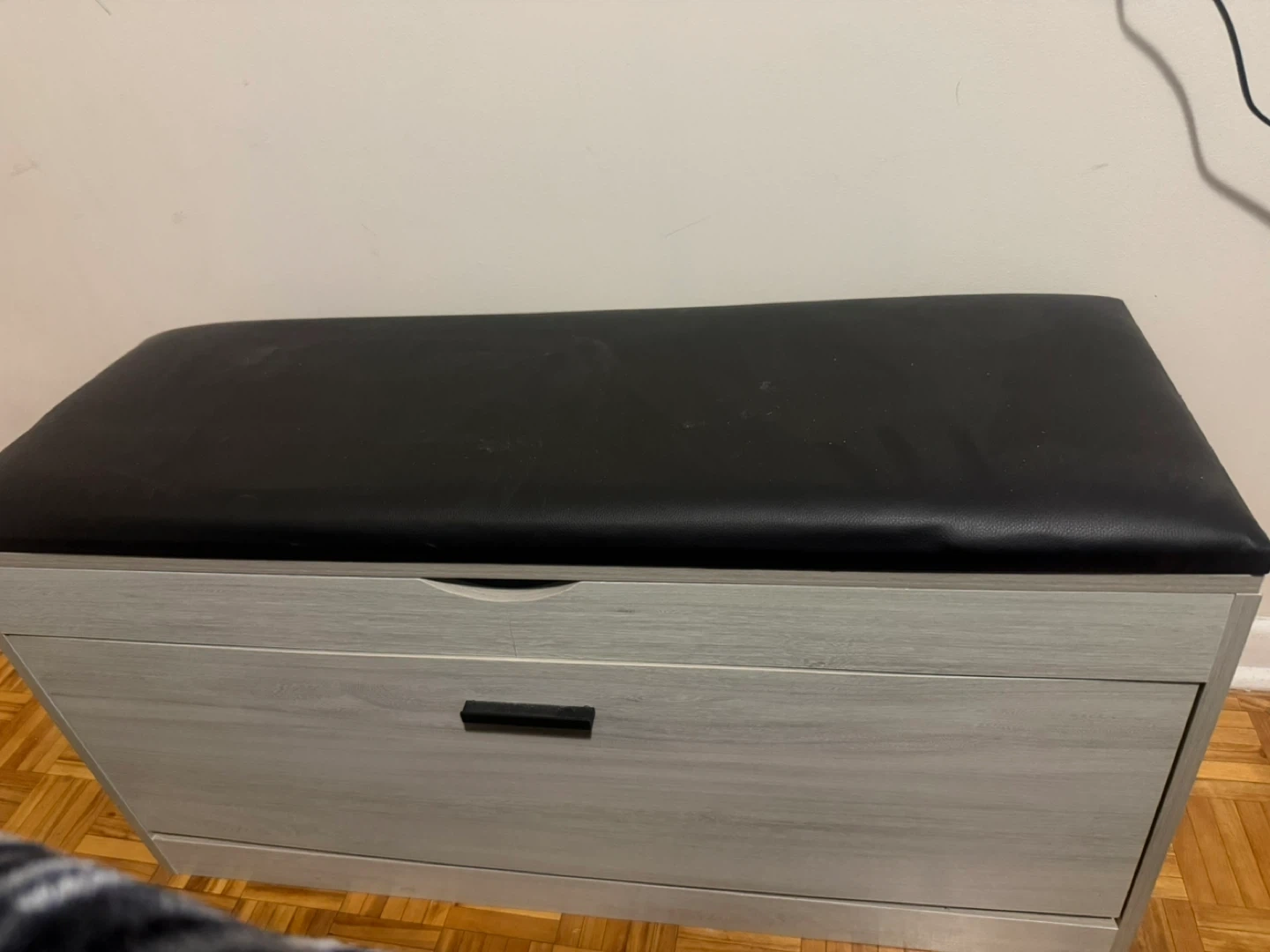 Selling a storage bench with a shoe rack! It's in great condition and perfect for organizing your entryway or mudroom. The bench has a comfortable padded top, and the shoe rack provides ample space for storing shoes. It's a stylish and practical addition to any home