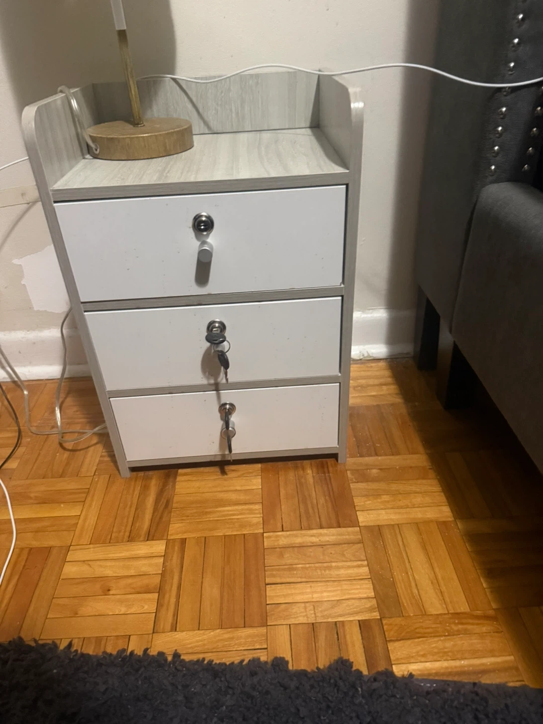 Selling a handy white nightstand with three drawers. Each drawer has its own lock and key, which is great for keeping things secure. It's in good condition but the KEYS DO NOT LOCK.It would be perfect next to a bed or sofa!