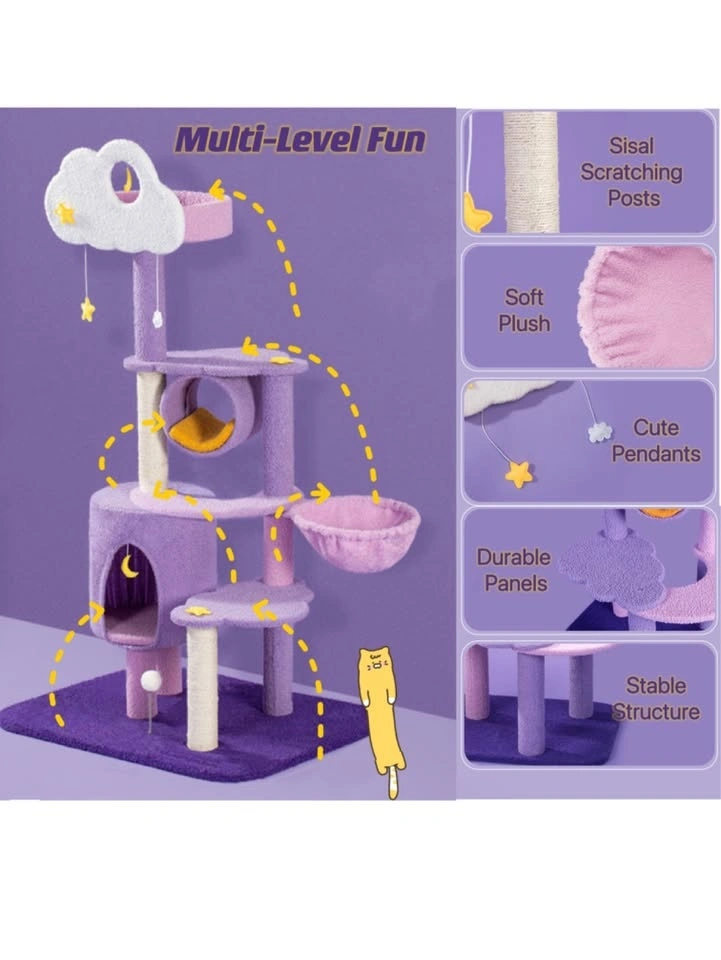brand new 60 Inches Cat Tree for Indoor Cats, Multi-Level Cat Tower for Large Cats Cute Purple Pink Cat Tree Unique Cat Condo with Scratching Post Hammock Condo Pompom Ball Toy