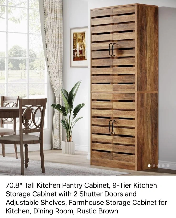 Rustic brown finish with shutter-style doors and adjustable shelves – perfect for kitchen, dining room, or extra storage. Bought new for $319.99, but we changed our minds and never assembled it. Completely unused and in the box. >Price: $150. >Pickup only in Pickering (Celebration Drive condos area). No delivery. Feel free to message for more details.