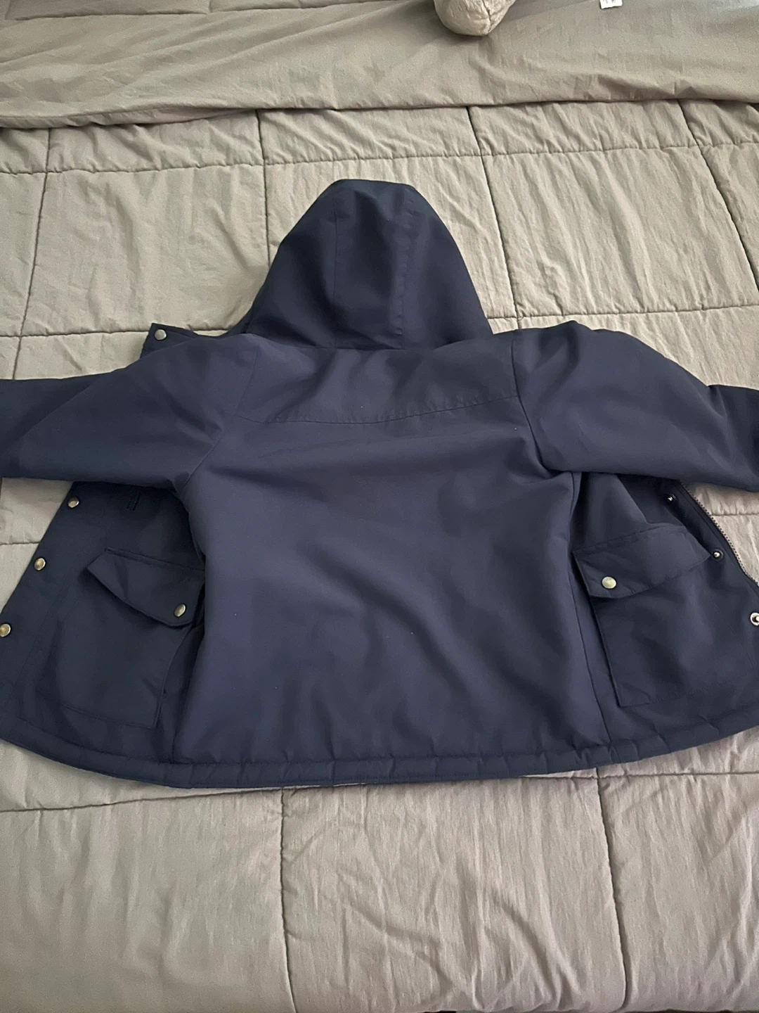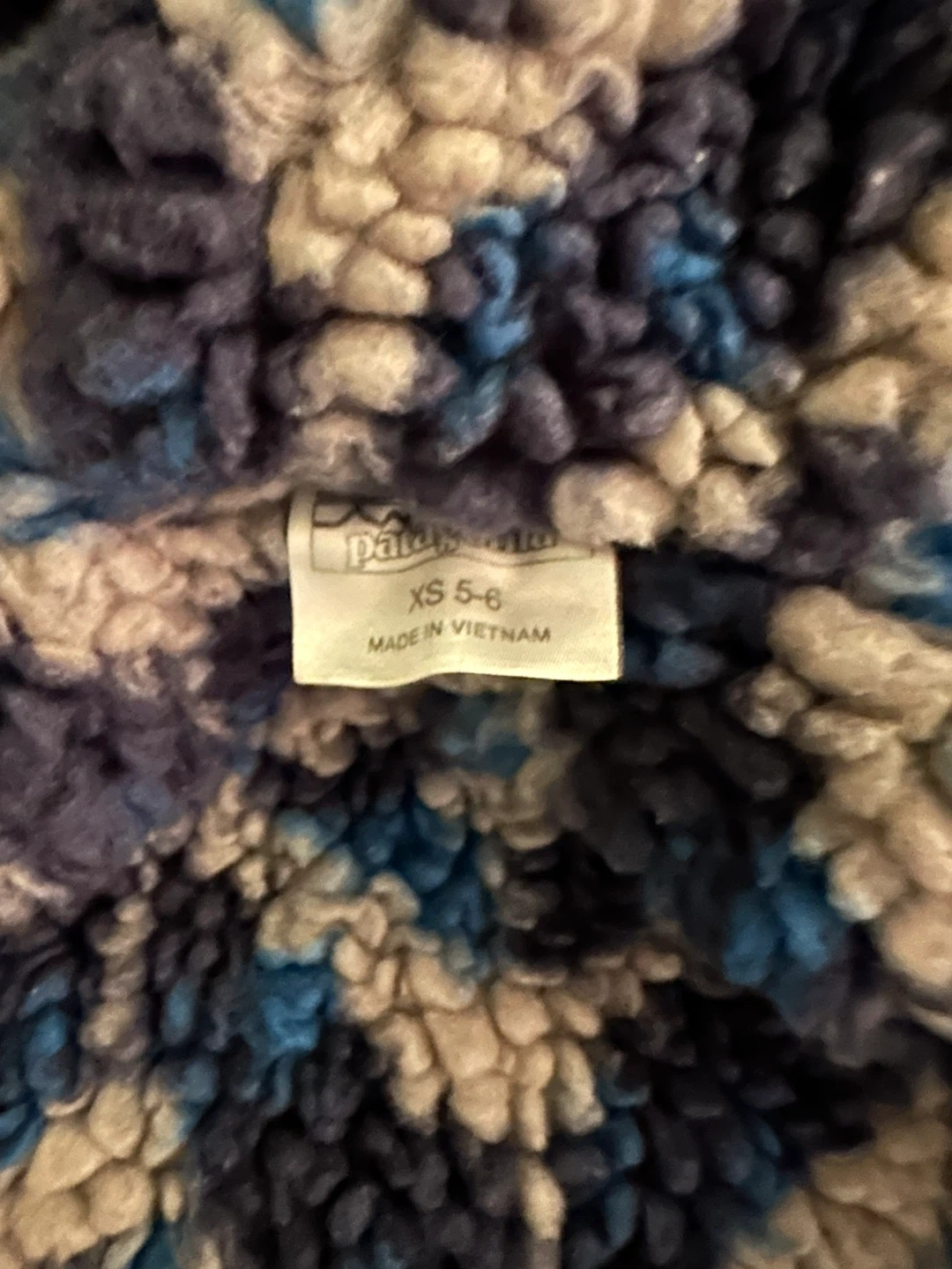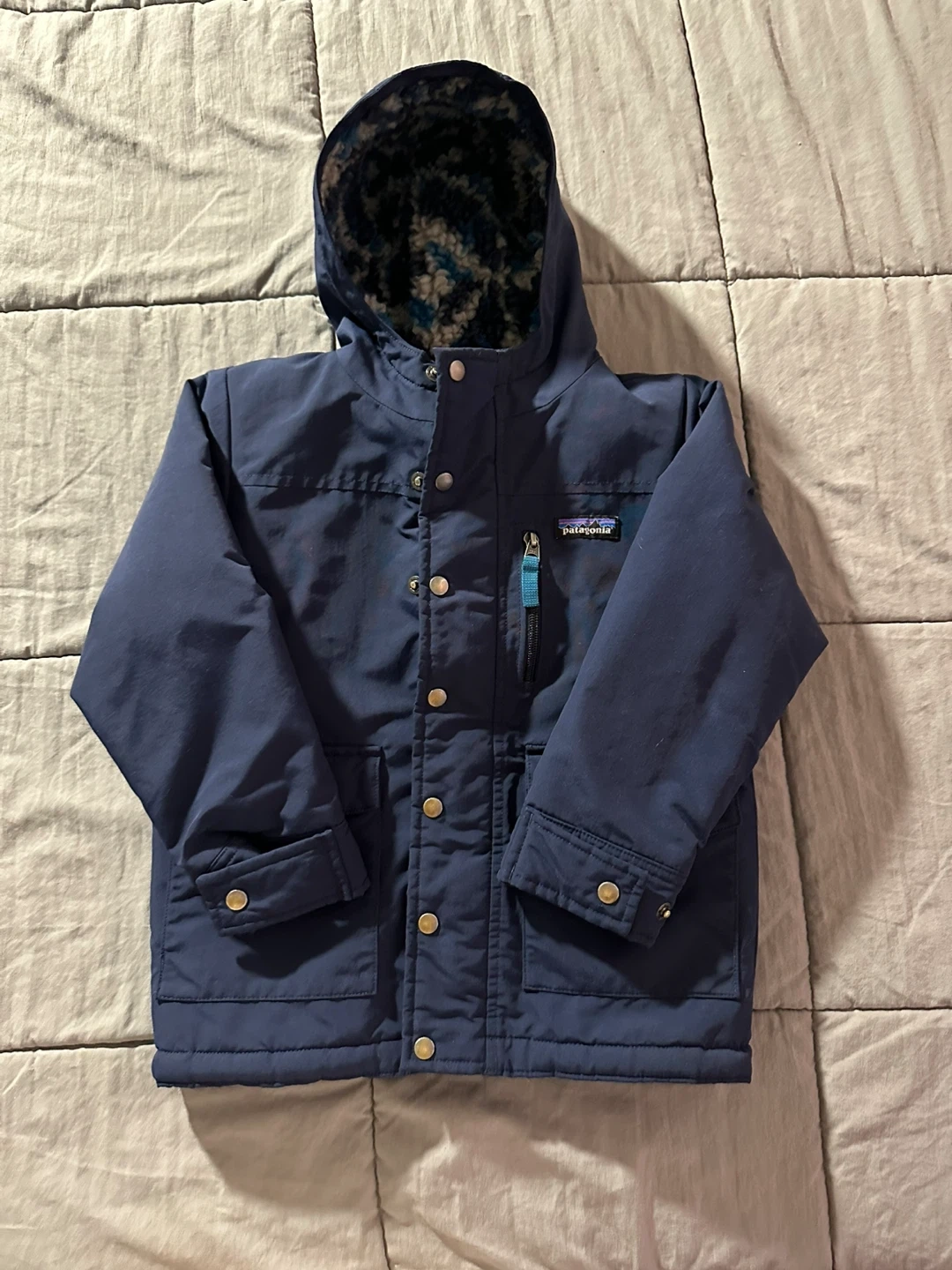 Selling a Patagonia kids' jacket, size XS (5-6). It's in great shape and ready for a new owner! The outer material is a solid navy blue, while the inside of the hood is lined with a colorful, patterned fleece material.. .. East 106th and 1st ave
