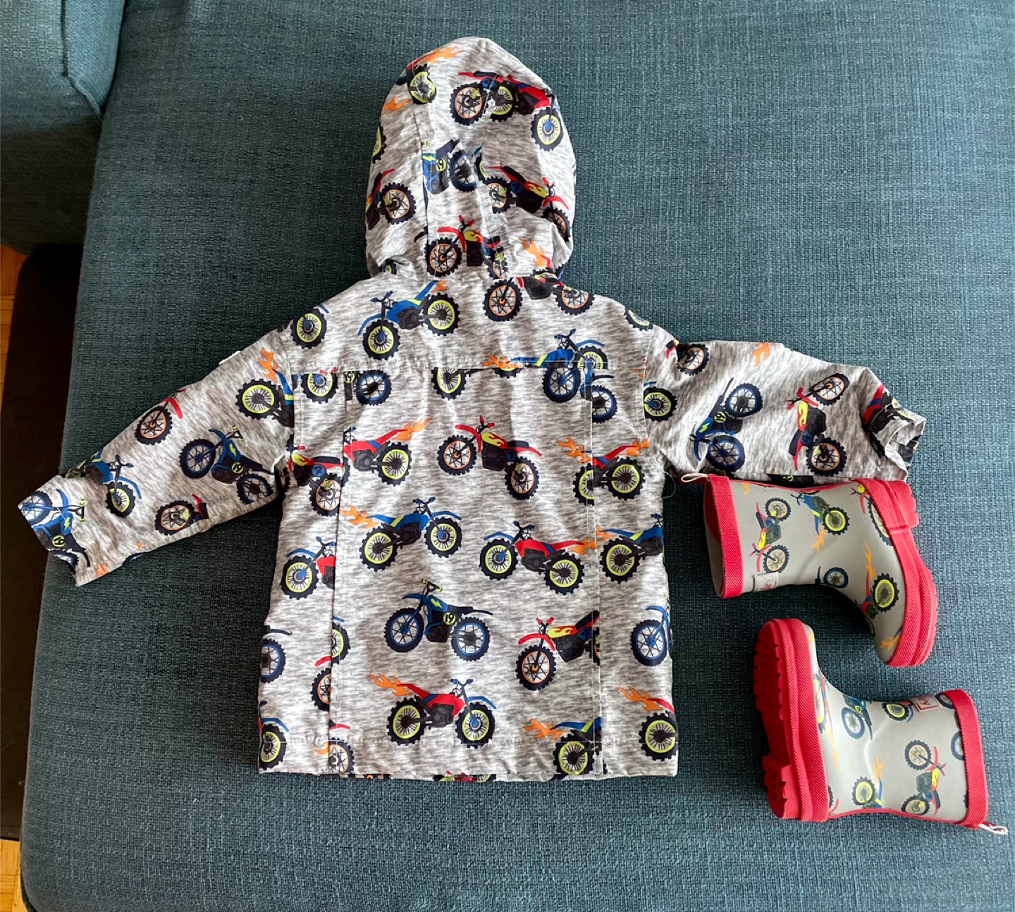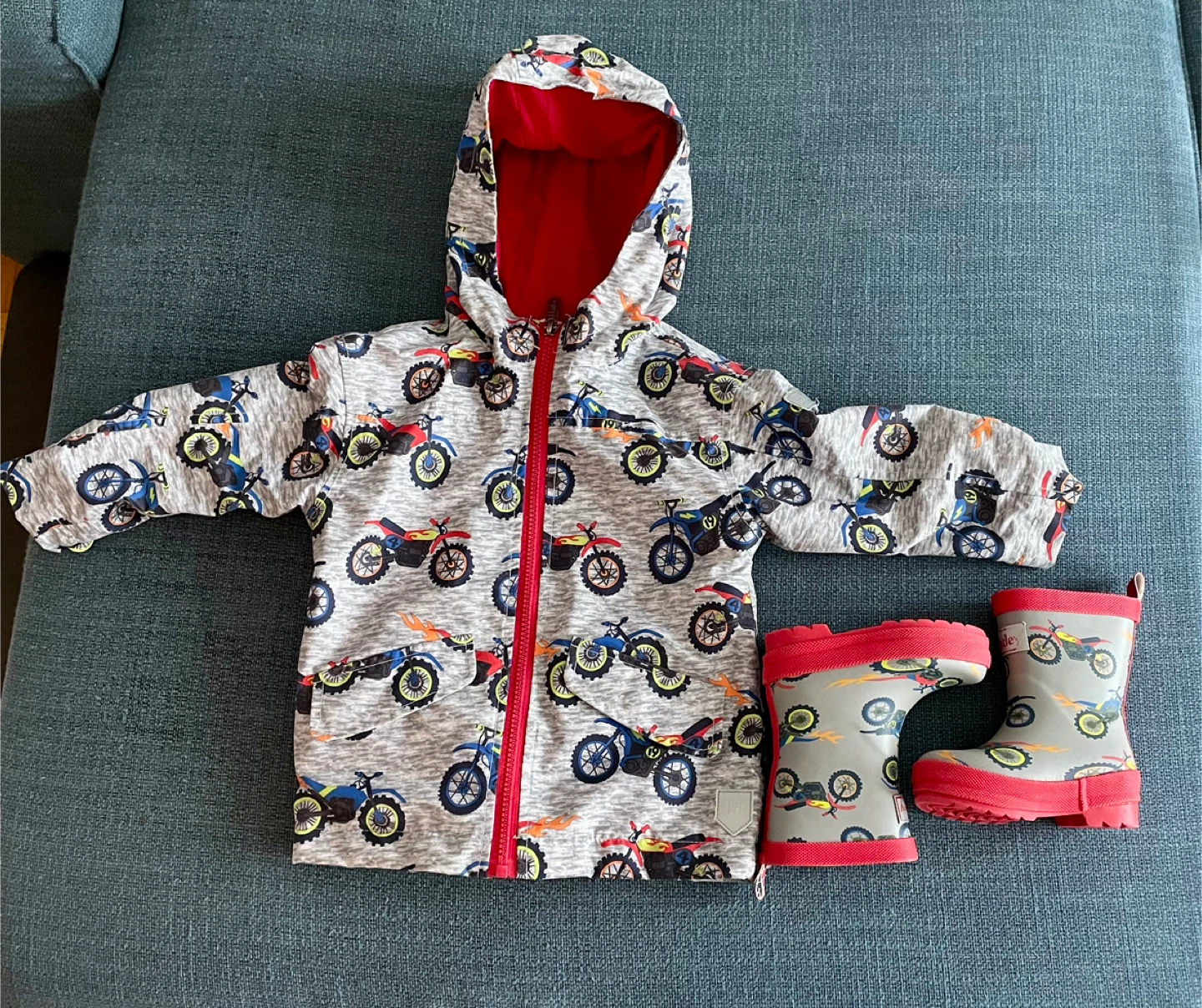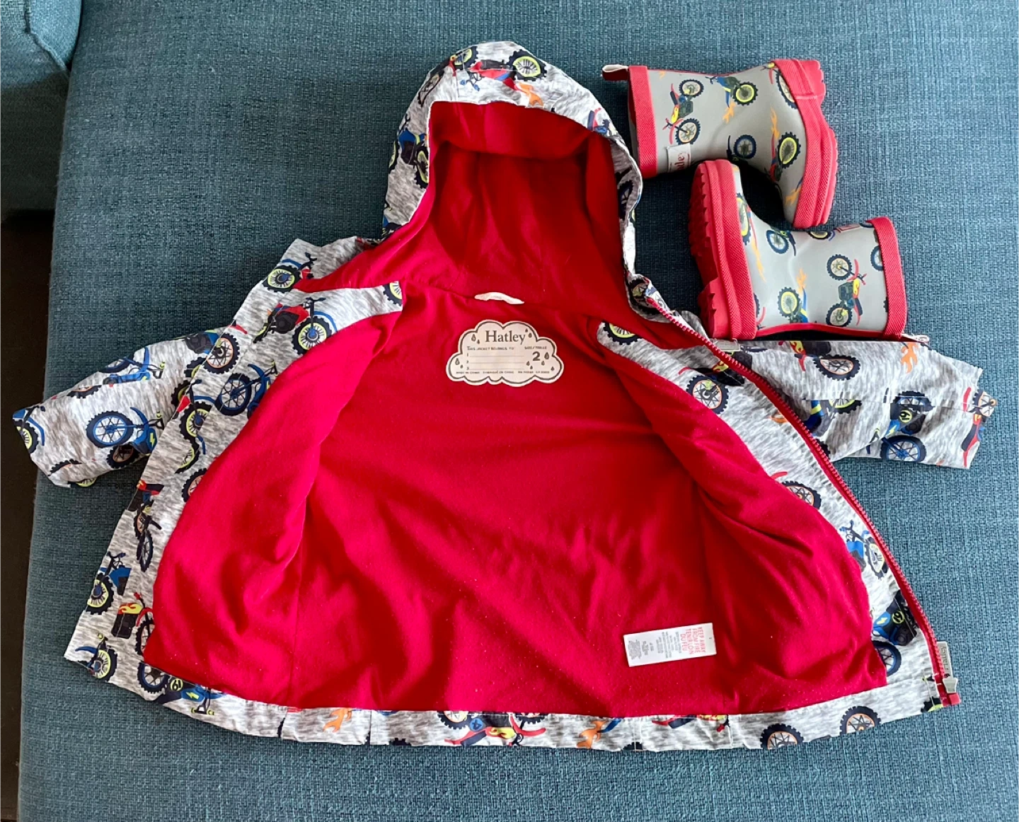 Adorable Hatley raincoat and rain boots set, jacket size 2T, Boots toddler size 5! The raincoat features a fun motorcycle print with a bright red lining. The matching rain boots complete the look for puddle-jumping adventures! Both items are in great condition