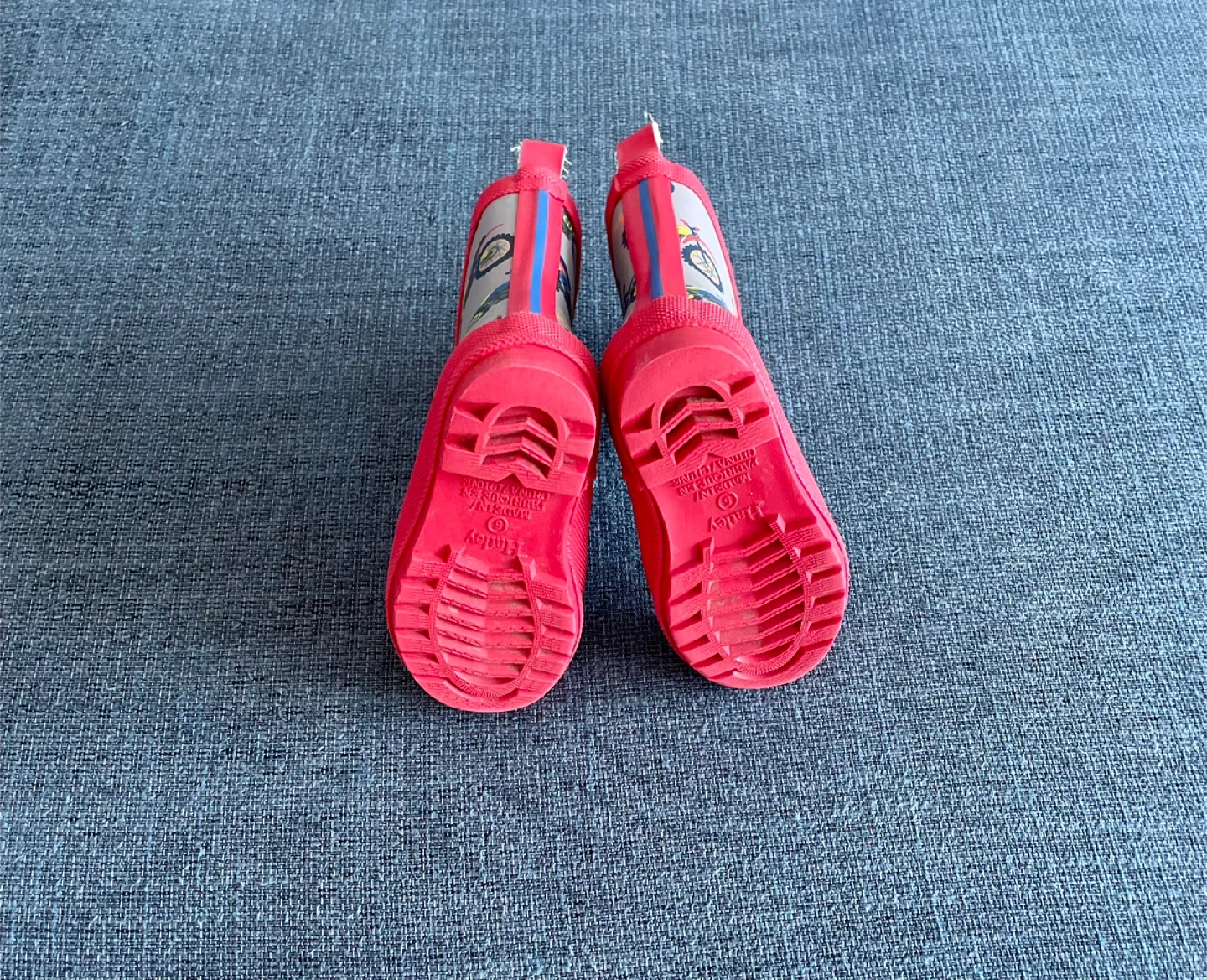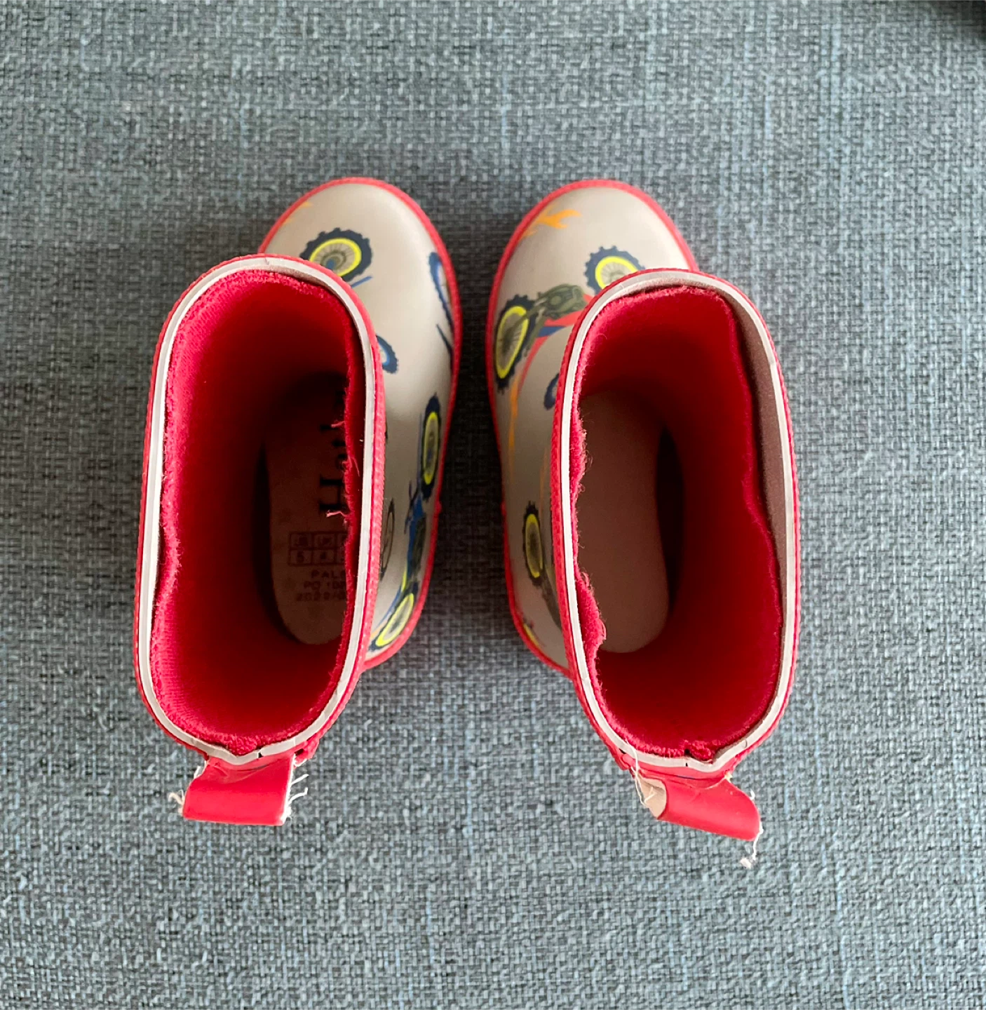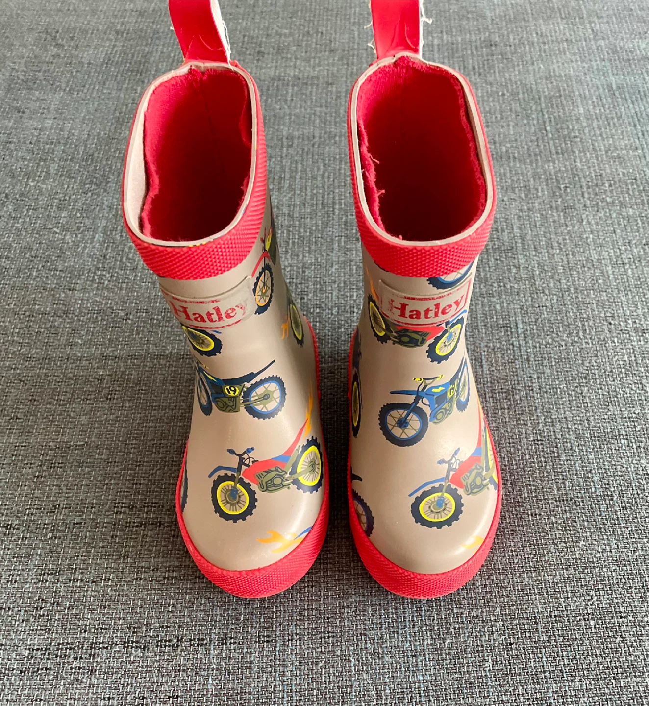Adorable Hatley raincoat and rain boots set, jacket size 2T, Boots toddler size 5! The raincoat features a fun motorcycle print with a bright red lining. The matching rain boots complete the look for puddle-jumping adventures! Both items are in great condition