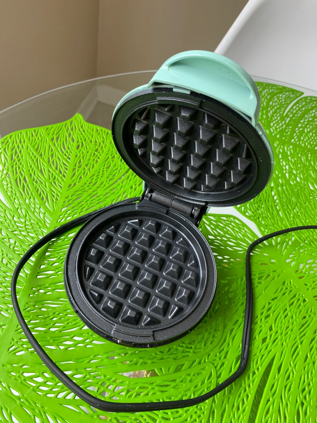 I'm selling a Dash Mini Waffle Maker in aqua! It's perfect for making single-serve waffles, and its compact size makes it easy to store. It heats up quickly, so you can enjoy a tasty waffle in minutes. Great for small kitchens or anyone who loves a quick breakfast!