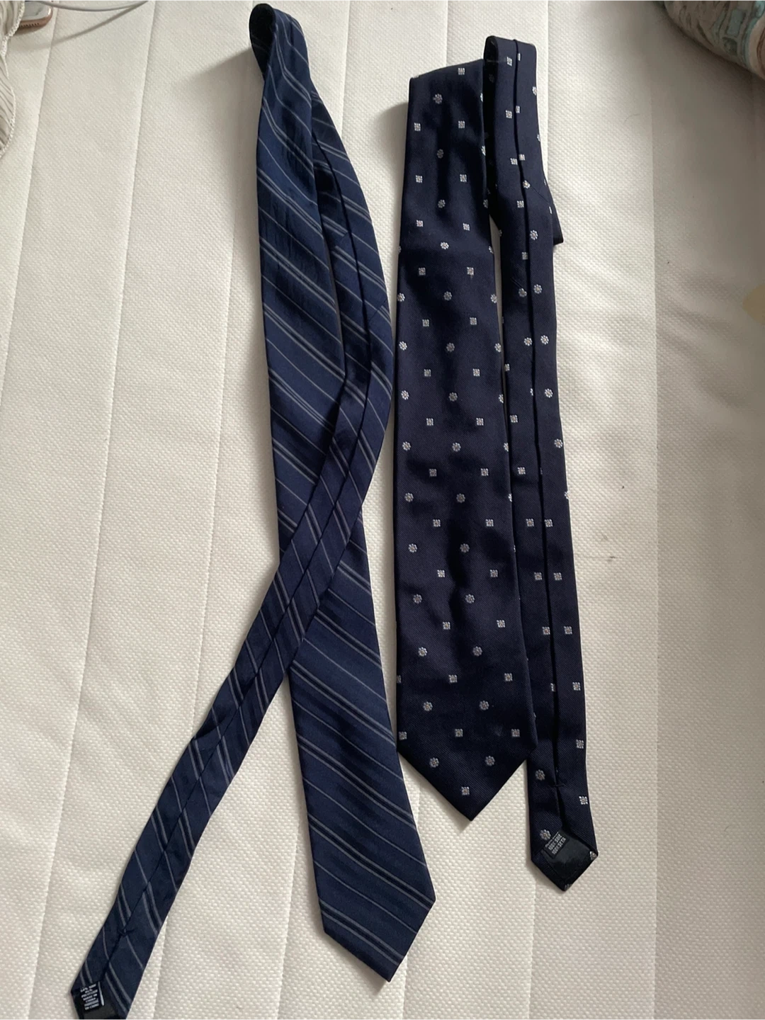 Selling two navy blue ties! One has a striped pattern and the other has a floral pattern. They're both in great condition and ready to wear