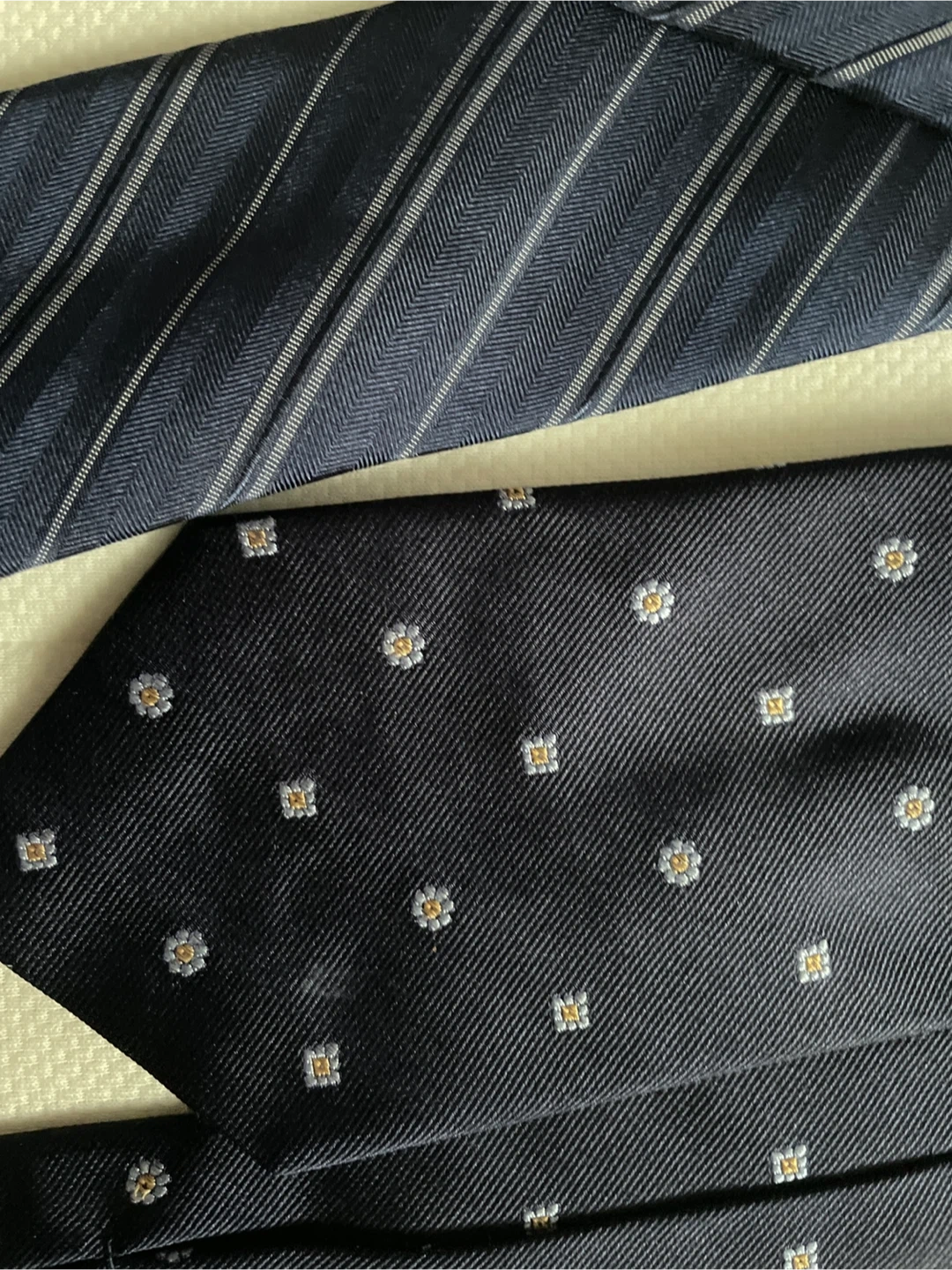 Selling two navy blue ties! One has a striped pattern and the other has a floral pattern. They're both in great condition and ready to wear