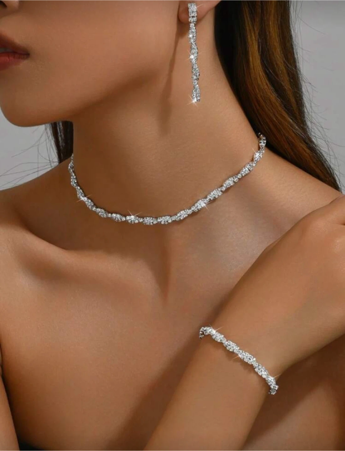 Selling a brand new, sparkling rhinestone jewellery set! It includes a necklace, bracelet, and a pair of earrings. Perfect for adding a touch of glamour to any outfit!