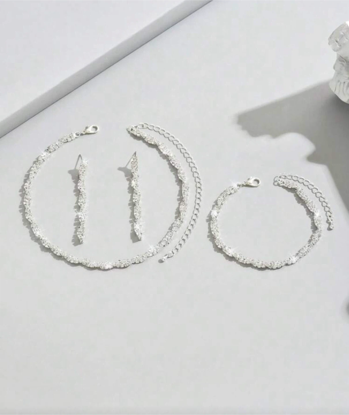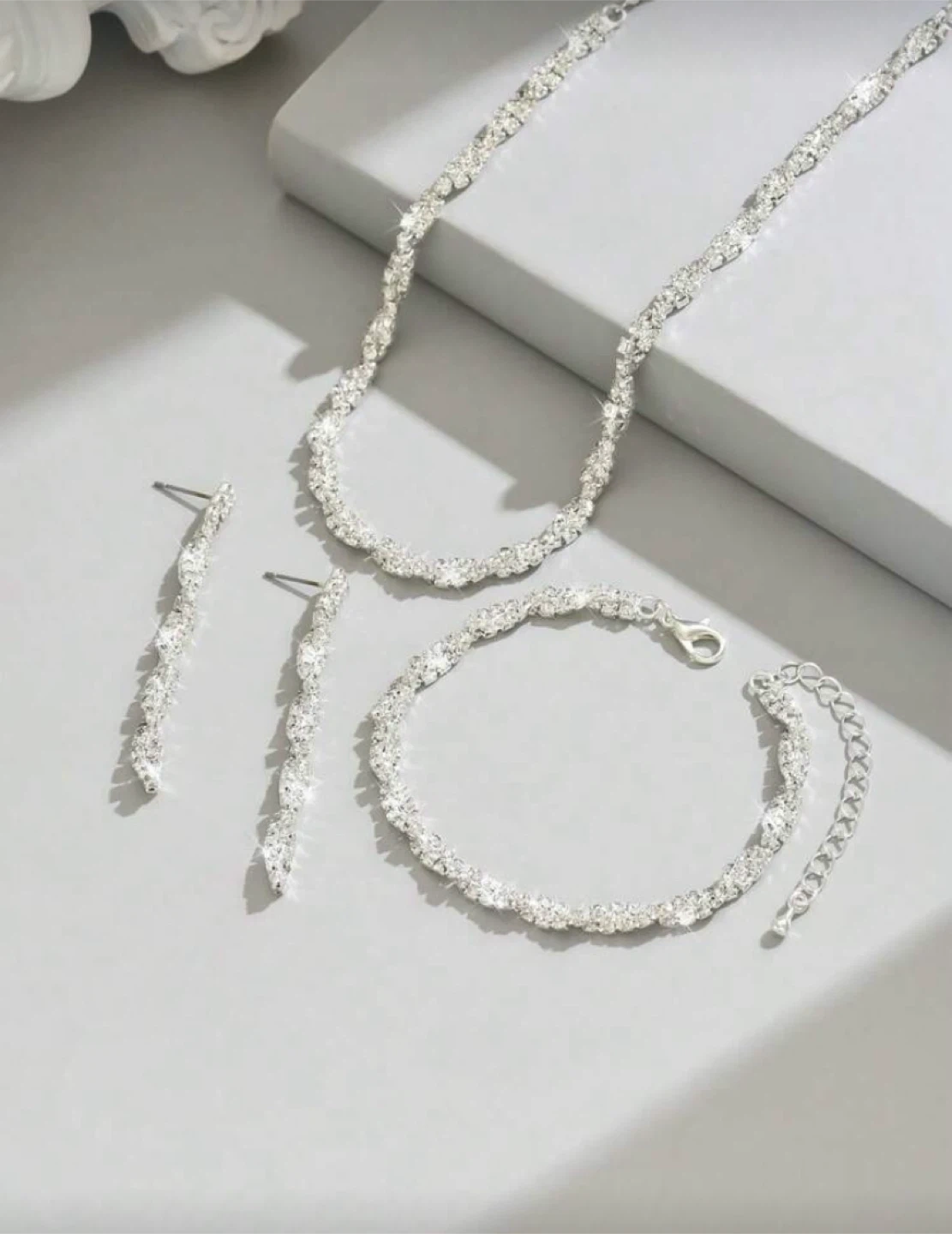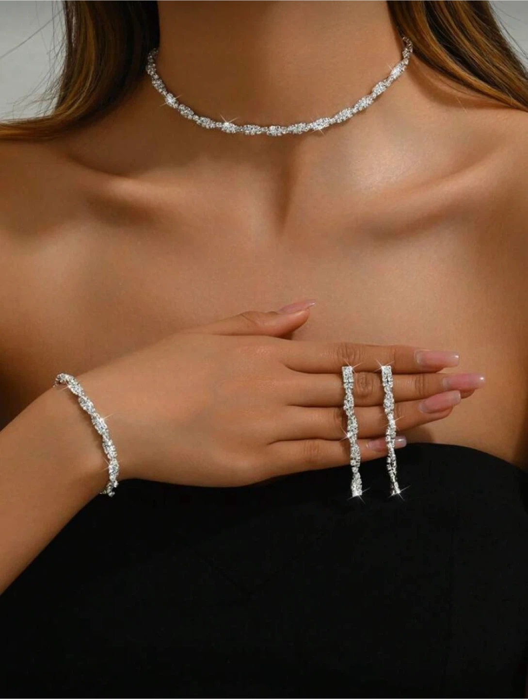 Selling a brand new, sparkling rhinestone jewellery set! It includes a necklace, bracelet, and a pair of earrings. Perfect for adding a touch of glamour to any outfit!