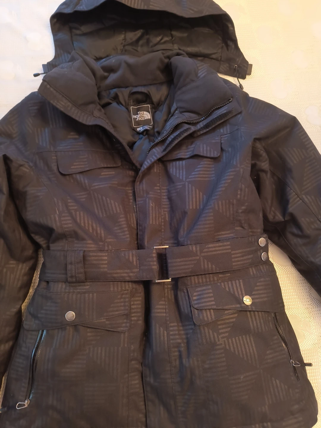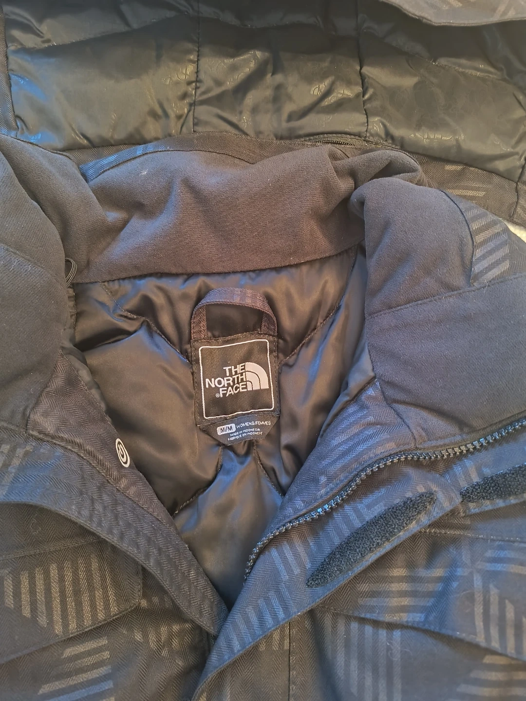 Selling a The North Face puffer jacket in size medium. It's in great condition and has a stylish black patterned design. Perfect for staying warm this winter!