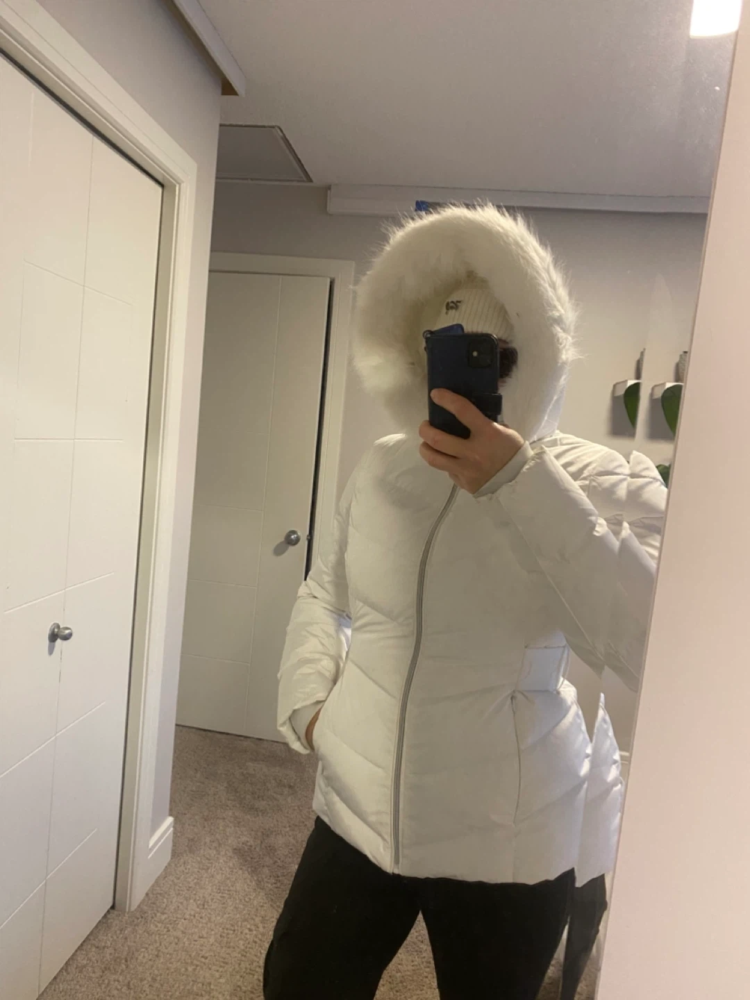 Selling a Guess white puffer jacket in size medium. It's in great condition and features a faux fur hood. The jacket is lined with real down, making it lightweight and warm. Perfect for the