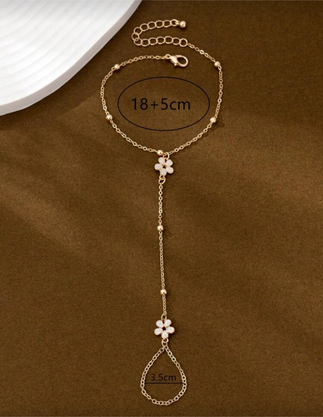 Selling a beautiful gold hand chain bracelet featuring delicate flower accents. It measures 18+5cm around the wrist and 3.5cm for the finger loop. It's a lovely piece to add a touch of elegance to any outfit!