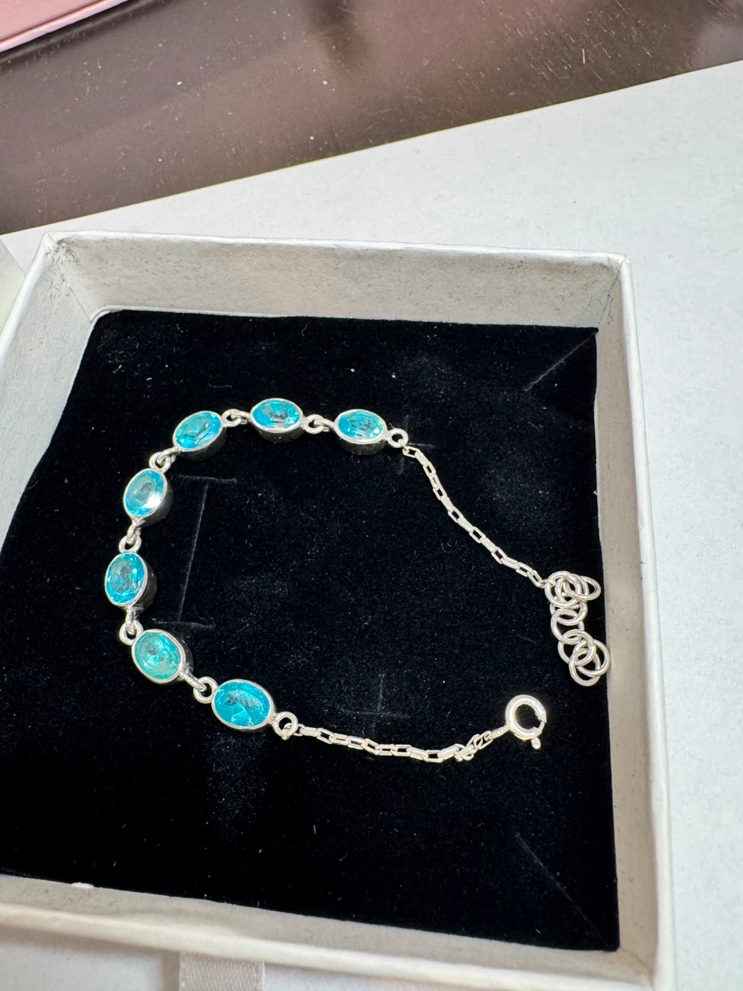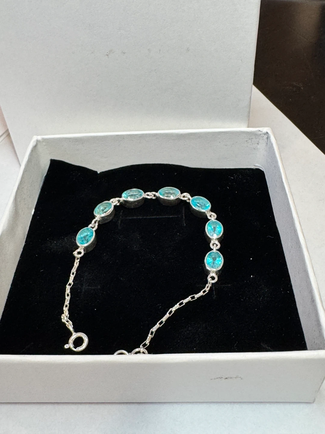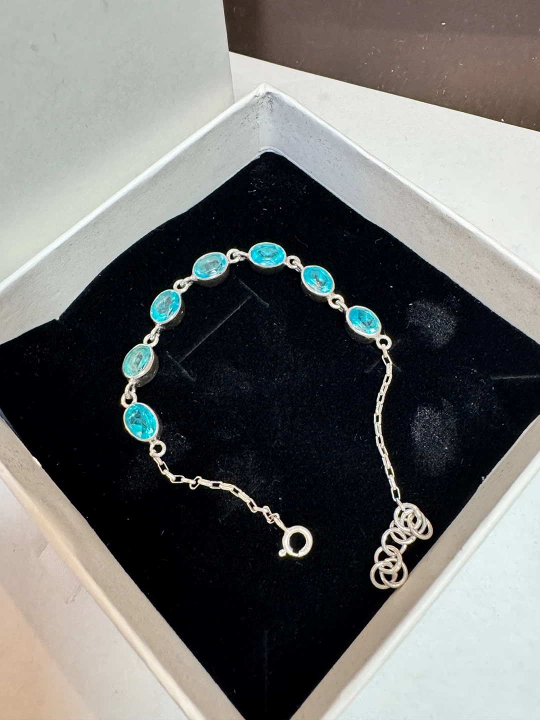 πΈπΈHere's a lovely silver bracelet featuring beautiful blue stones. It comes in its original box, ready to be worn or gifted! paraiba topaz bracelet. Length 16cm - 18cm.πΈπΈ