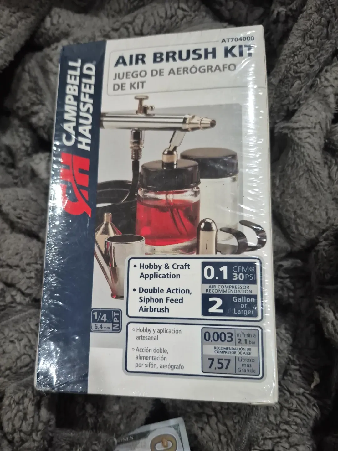 Selling a Campbell Hausfeld Air Brush Kit, model AT704000. It's designed for hobby and craft applications and features a double-action, siphon-feed airbrush. The box includes specifications for air compressor recommendations.