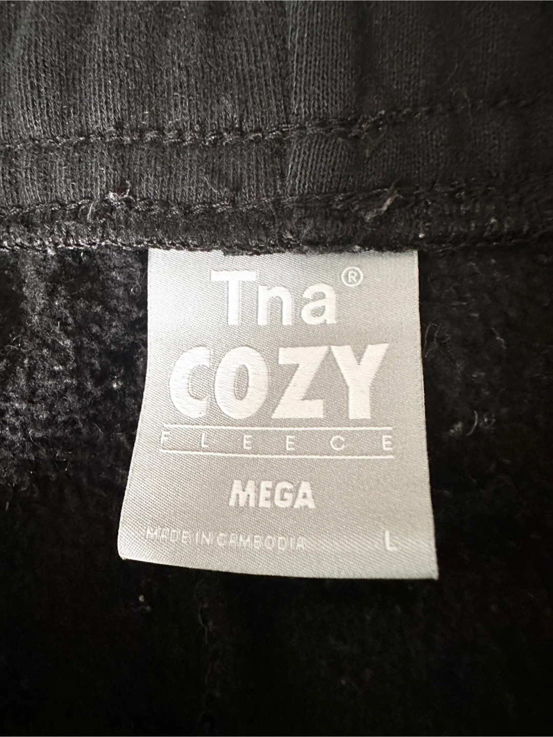 Selling a pair of Tna COZY Fleece MEGA cargo pants in black, size large. They're super comfy and in great condition! Perfect for lounging or running errands around town. Check out the photos for details!