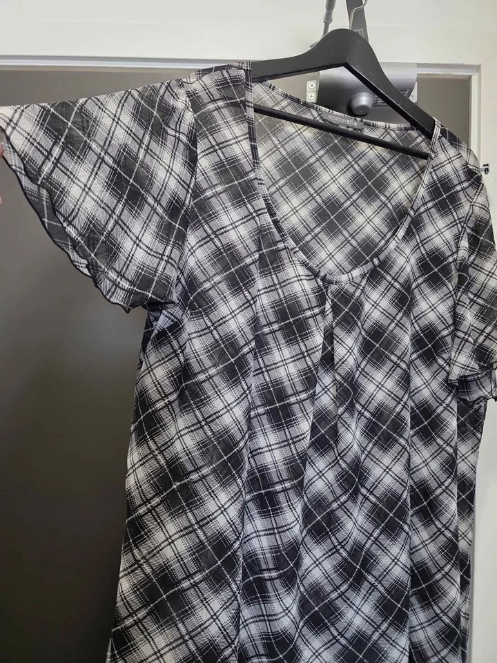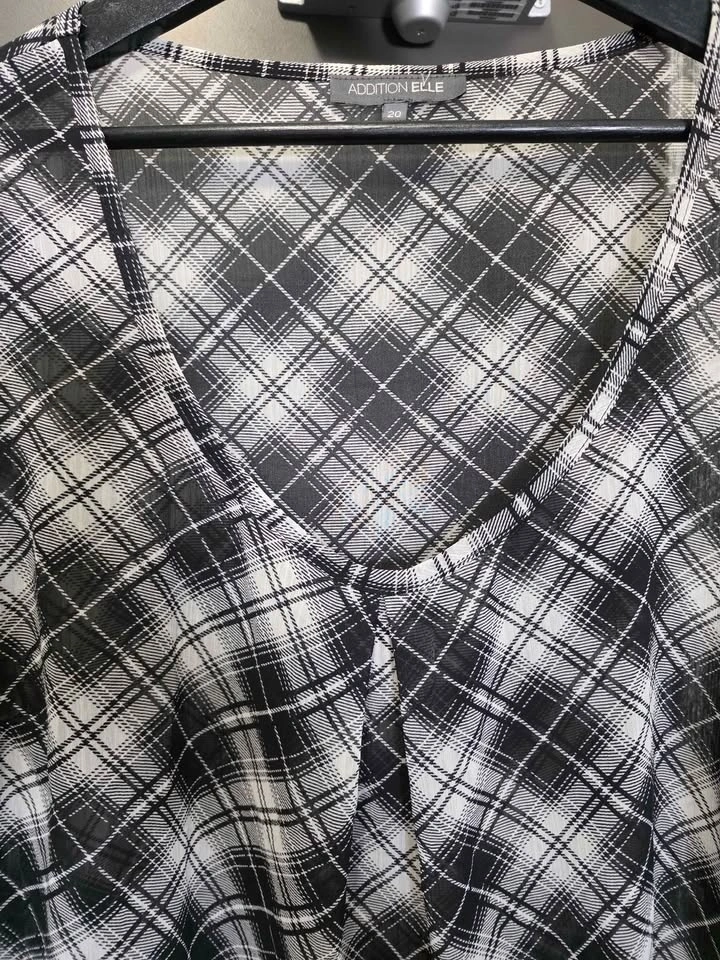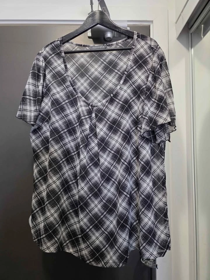 Addition Elle sheer scoop necked top with short butterfly sleeves. Black and white checkered design with fold at cleavage and side slits. Nice length. New. 100% polyester. Size 20. From a smoke free home.