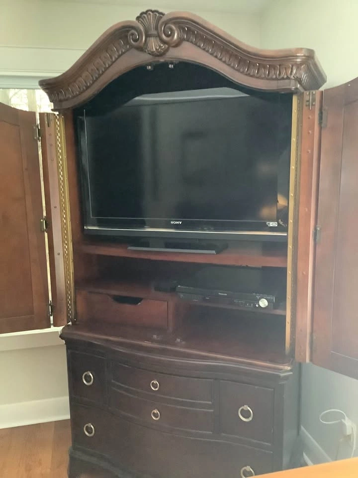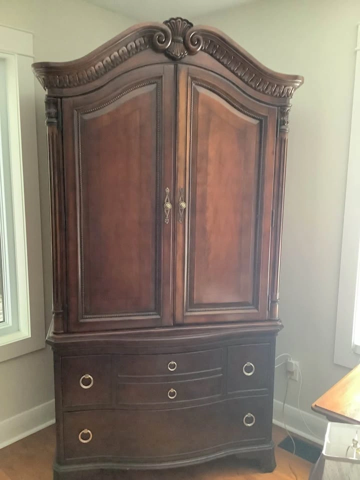 Beautiful and functional cherry wood armoire, suitable for a 42” TV. Dimensions are Height 83”, Width 43”, Depth 20”. Features three internal shelves and a hidden drawer in the top section, plus two deep drawers at the bottom. Let me know if you're interested!
