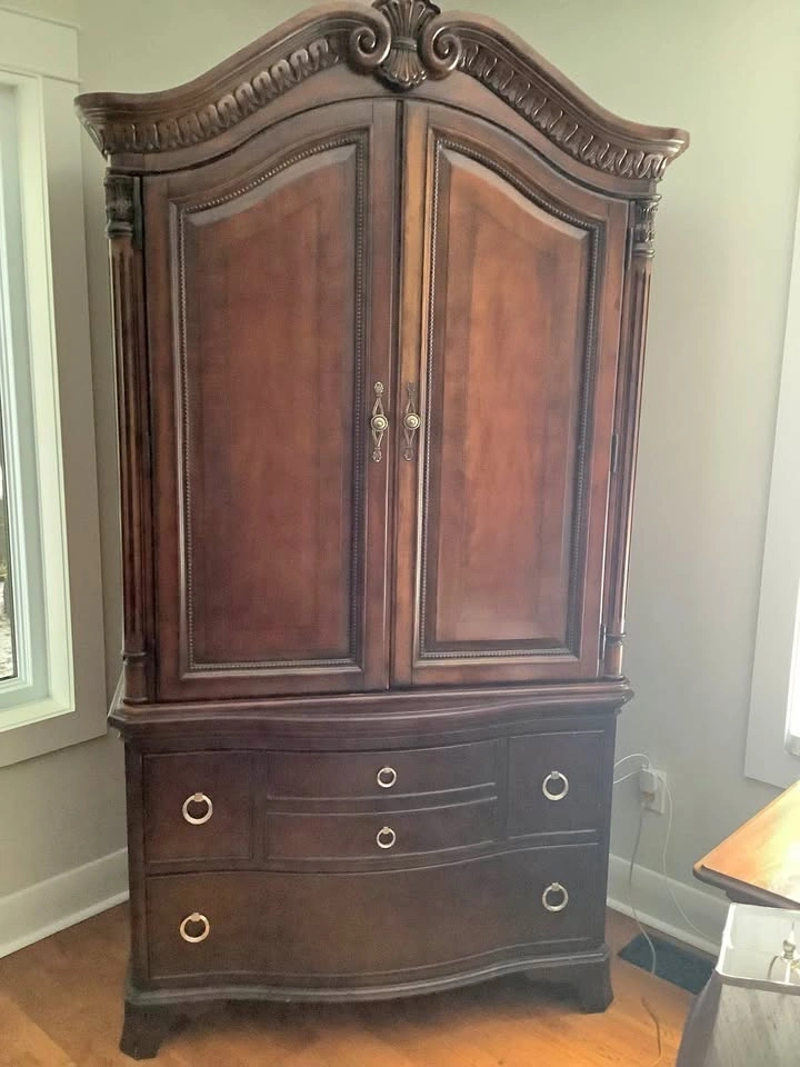 Beautiful and functional cherry wood armoire, suitable for a 42” TV. Dimensions are Height 83”, Width 43”, Depth 20”. Features three internal shelves and a hidden drawer in the top section, plus two deep drawers at the bottom. Let me know if you're interested!
