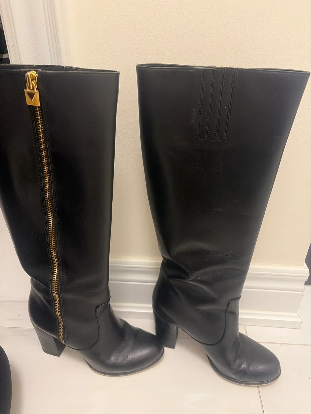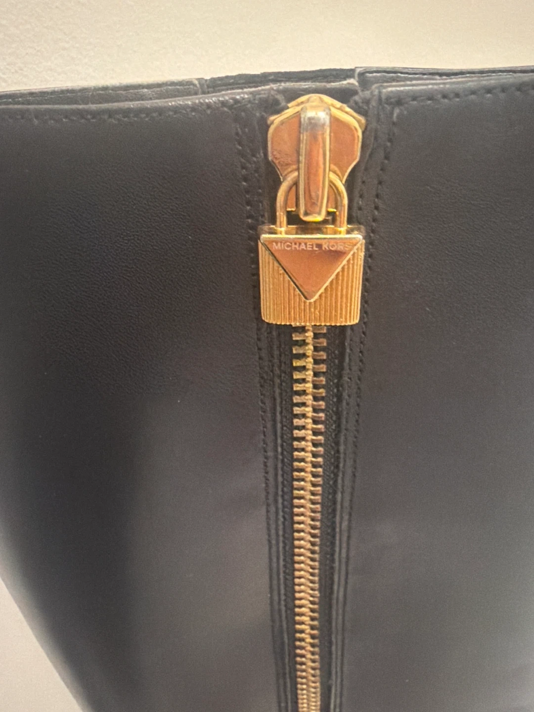 Here are some Michael Kors knee-high boots in black leather! They feature a gold zipper and the Michael Kors logo on the zipper pull. They are in good condition and ready for a new home!
