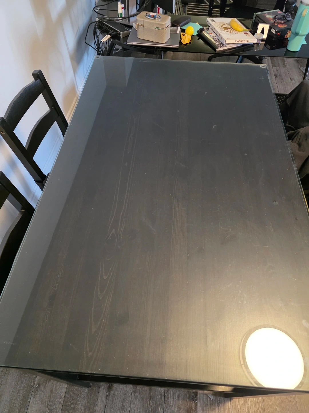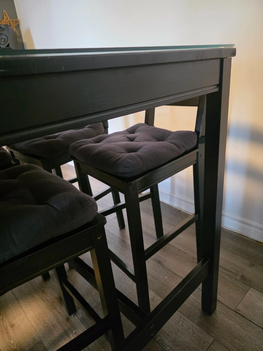 Selling a black dining table with four matching chairs. The set is in good condition and perfect for a small dining area or kitchen. 38" H 29" w 4ft length. Glass top. It's detachable for easy cleaning.