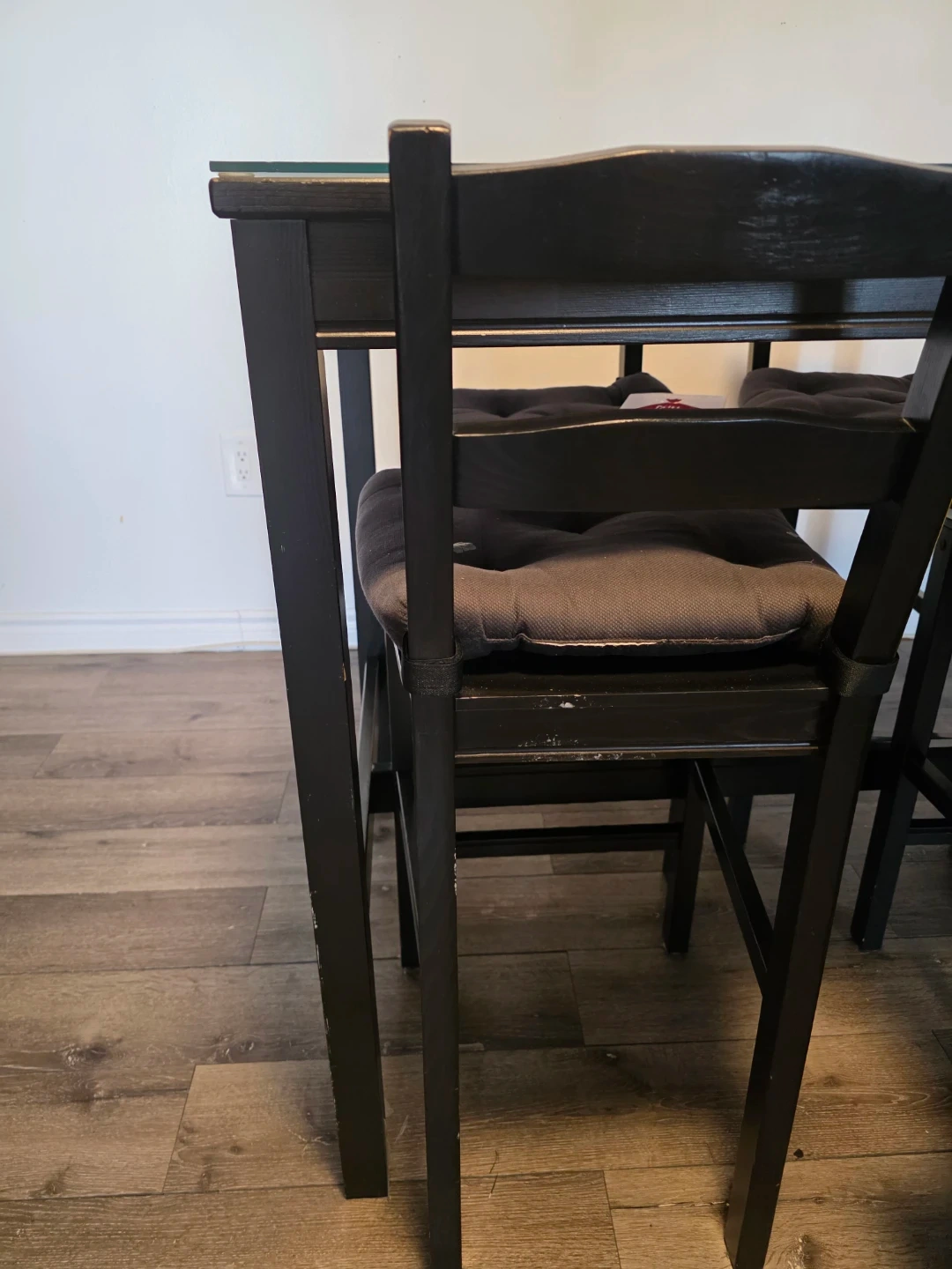 Selling a black dining table with four matching chairs. The set is in good condition and perfect for a small dining area or kitchen. 38" H 29" w 4ft length. Glass top. It's detachable for easy cleaning.