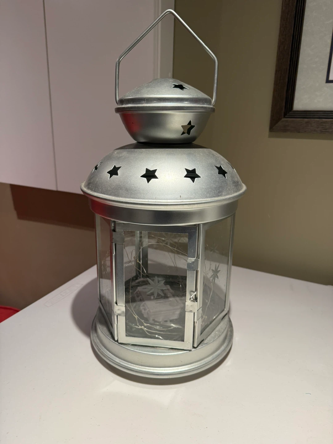 Add a touch of charm to your space with this silver decorative lantern! It features star cutouts and a cute design, perfect for creating a cozy atmosphere in any room
