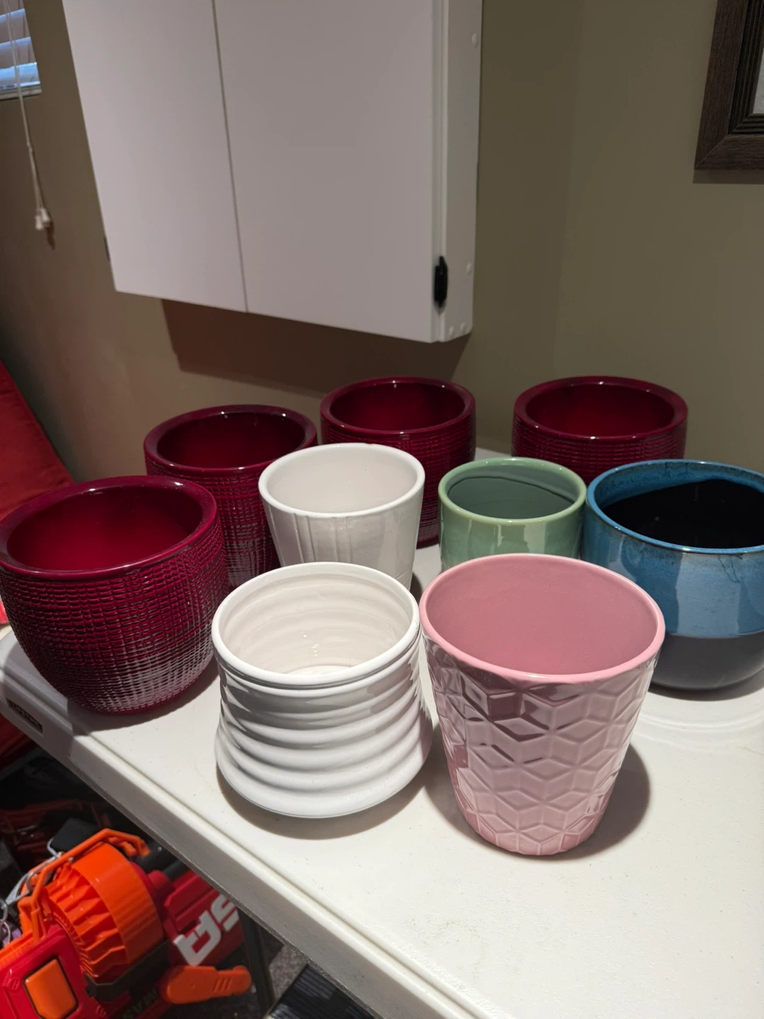 Selling a collection of decorative flower pots in various colours and styles! There are red, white, green, pink, and blue pots available. Perfect for adding a touch of colour to your indoor or outdoor space