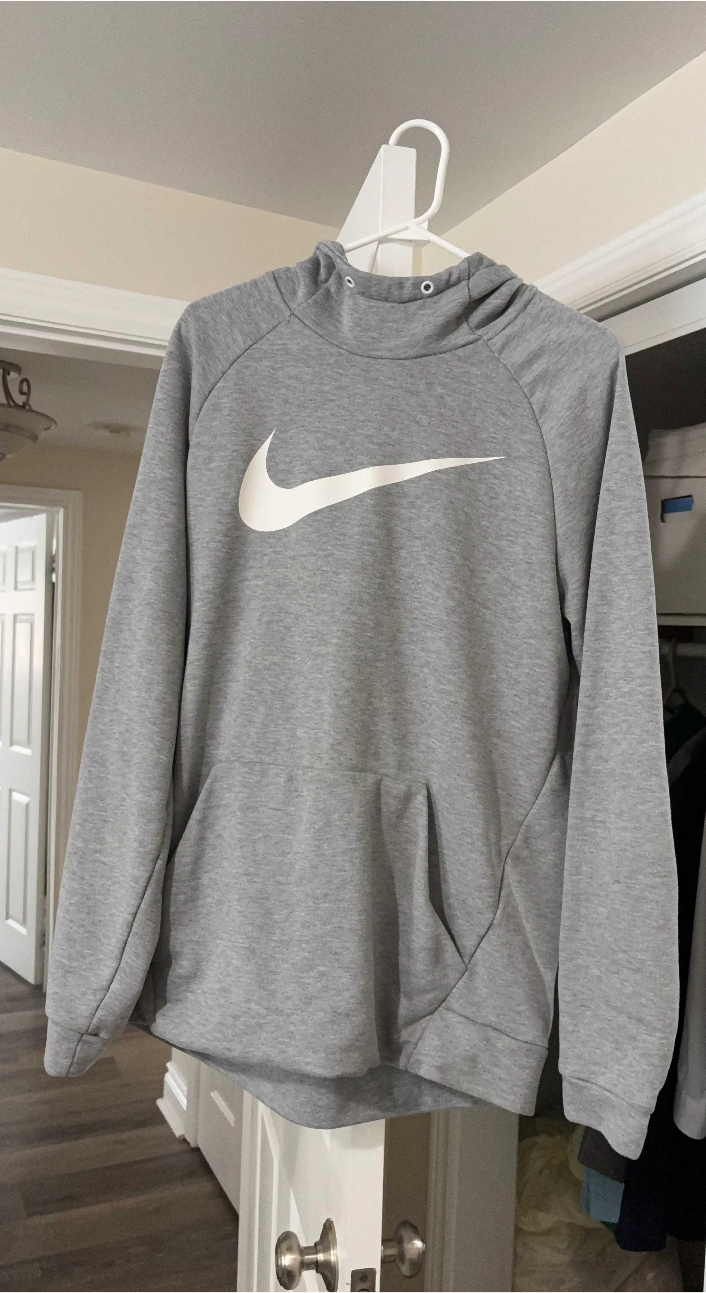 Selling a grey Nike hoodie! It's in great condition and super comfy for everyday wear. The classic Nike swoosh is prominently displayed on the front. Perfect for staying cozy on cooler days