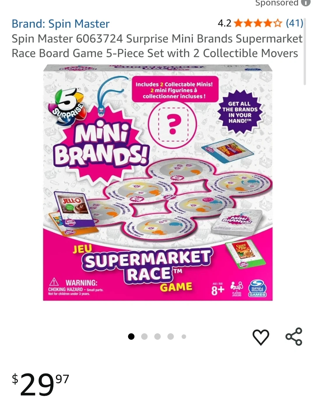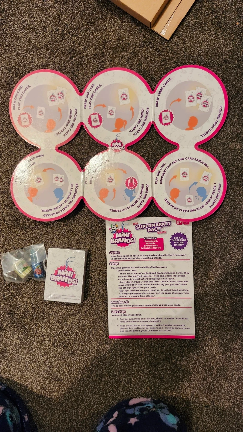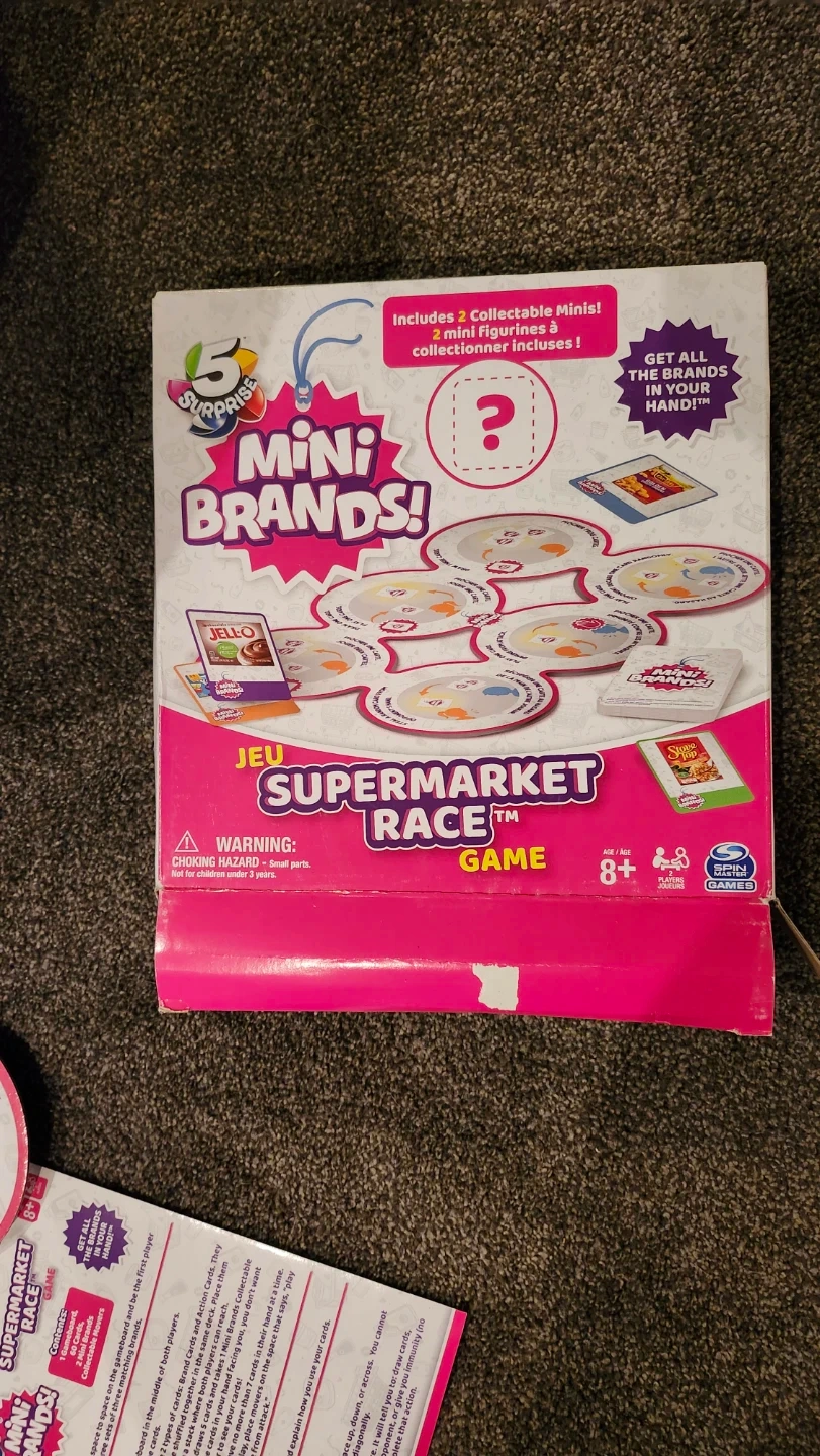 Selling a Spin Master Mini Brands Supermarket Race board game! It's a 5-piece set that includes 2 collectible movers. The box is included and it's recommended for ages 8+.